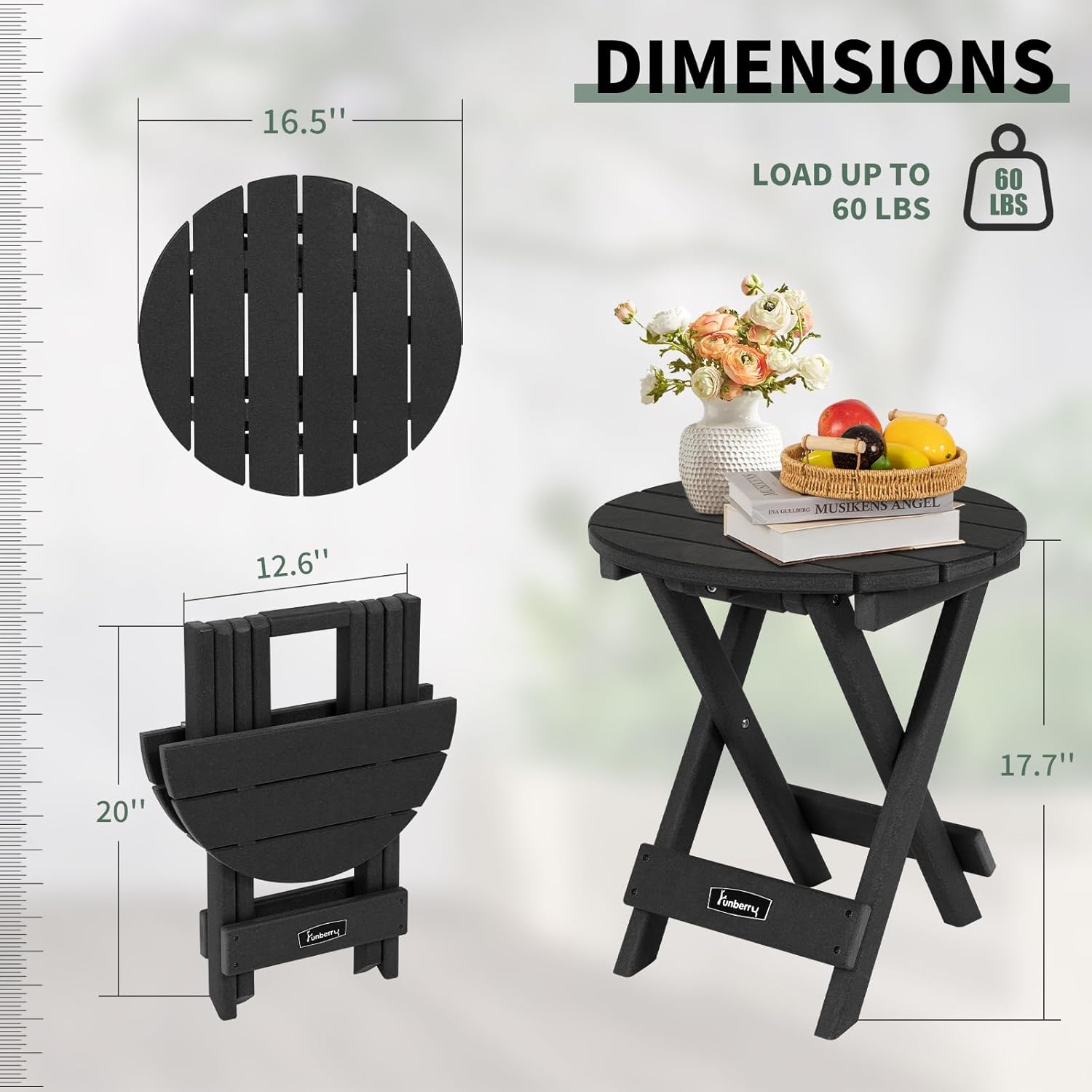 • Portable Folding Side Table: This patio side table is portable, with a quick fold-away design, you can easily carry it with you when fold it up. When unfolded, the diameter of the table top is 16.5'', and it's 17.7'' tall. This side table can hold up to 60 LBS. This patio end table is an ideal companion for Adirondack chairs, rocking chairs and chaise lounge chairs.