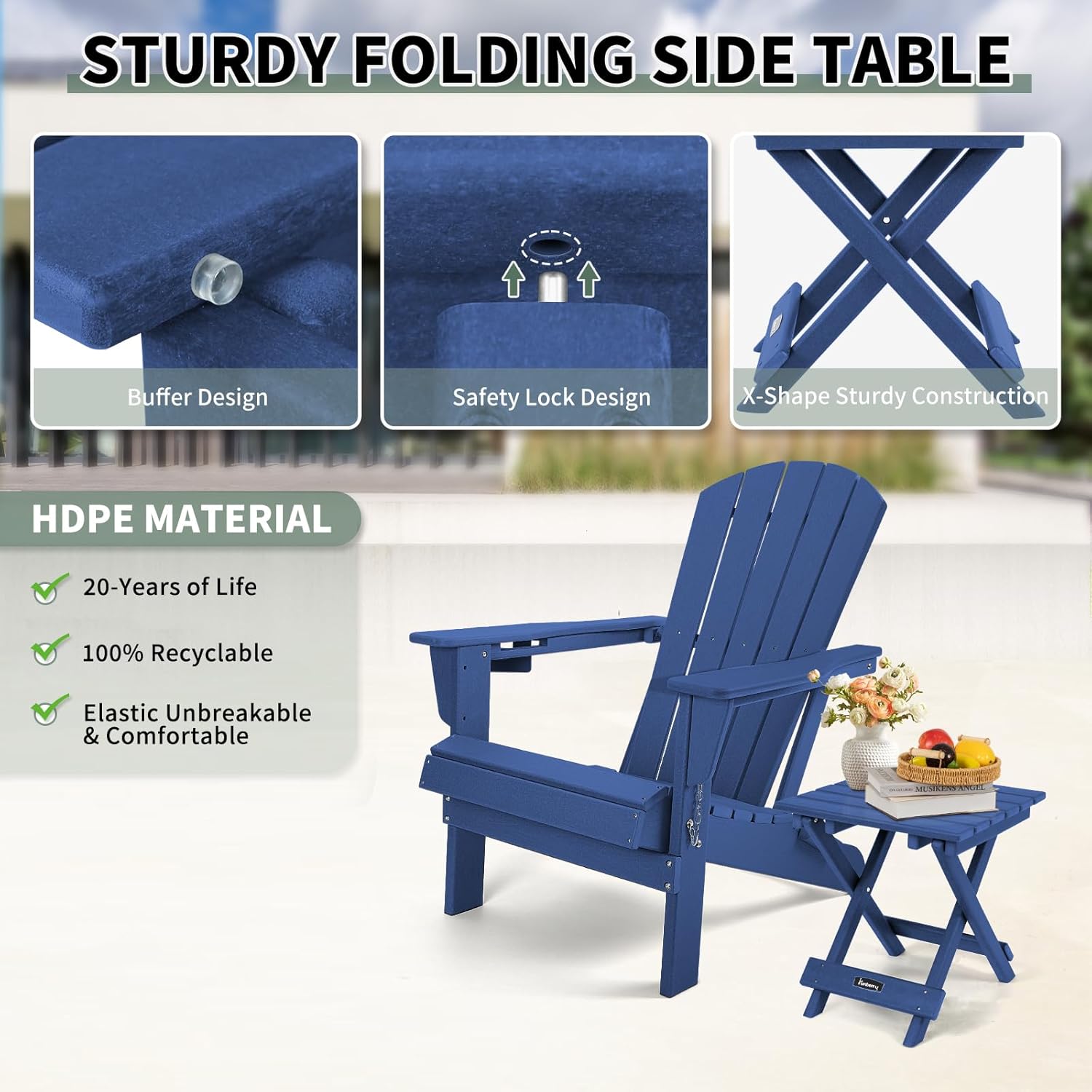 • Weather Resistant Durable Material: This Adirondack side table is made of HDPE (High Density Polyethylene) material, which makes it highly durable. This side table can withstand extreme climates without fading, cracking or rotting comparing to other materials like wood or plastic. This patio side table is waterproof, heat resistant and UV fade resistant.