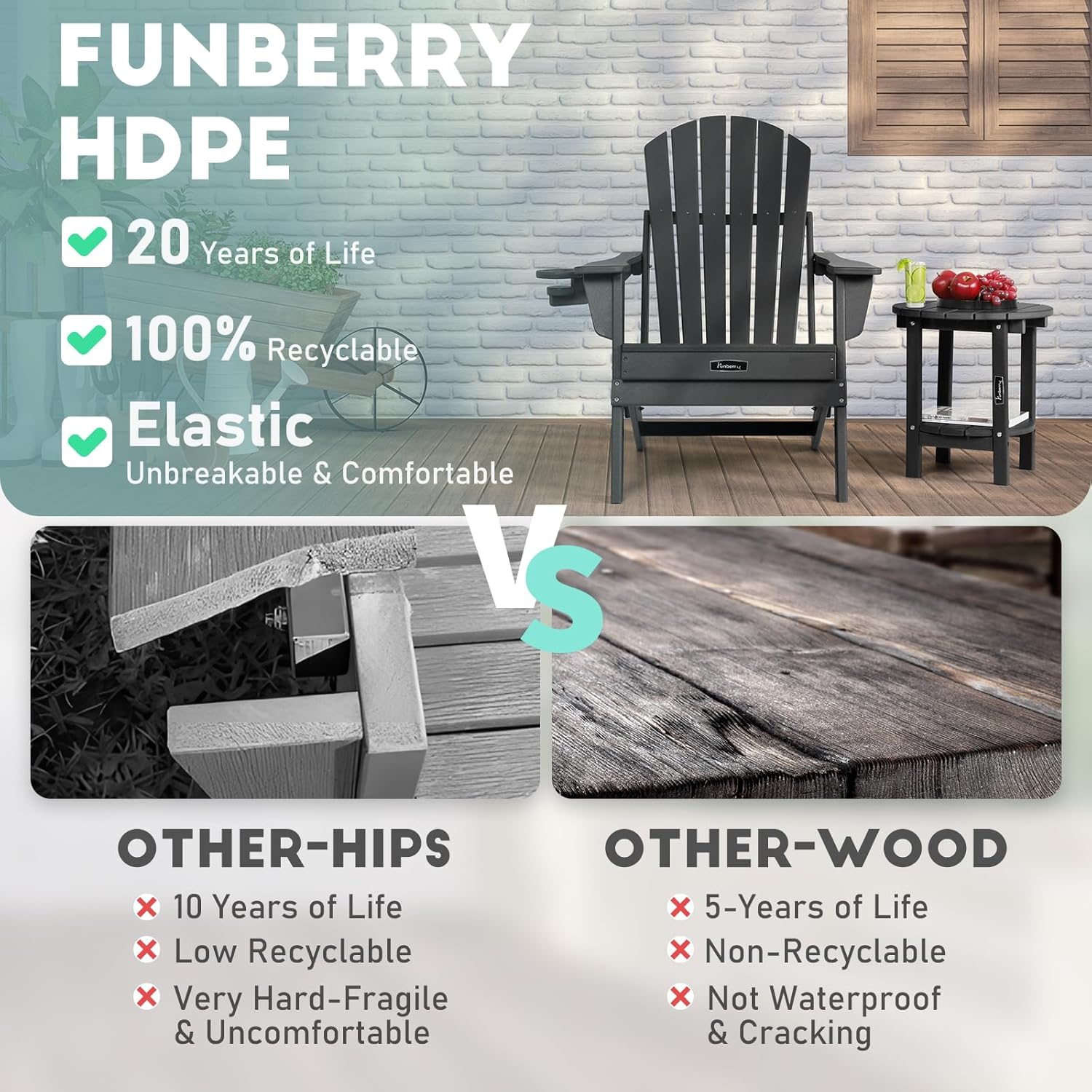 • All Weather Resistant Material: The HDPE material makes this Adirondack side table waterproof, heat resistant and UV fade resistant. You can use it outdoor in all kinds of weather including hot sun, heavy snow, torrential rain, salt spray, and strong coastal winds. This side table looks like real wood but will not crack or rot like wood.