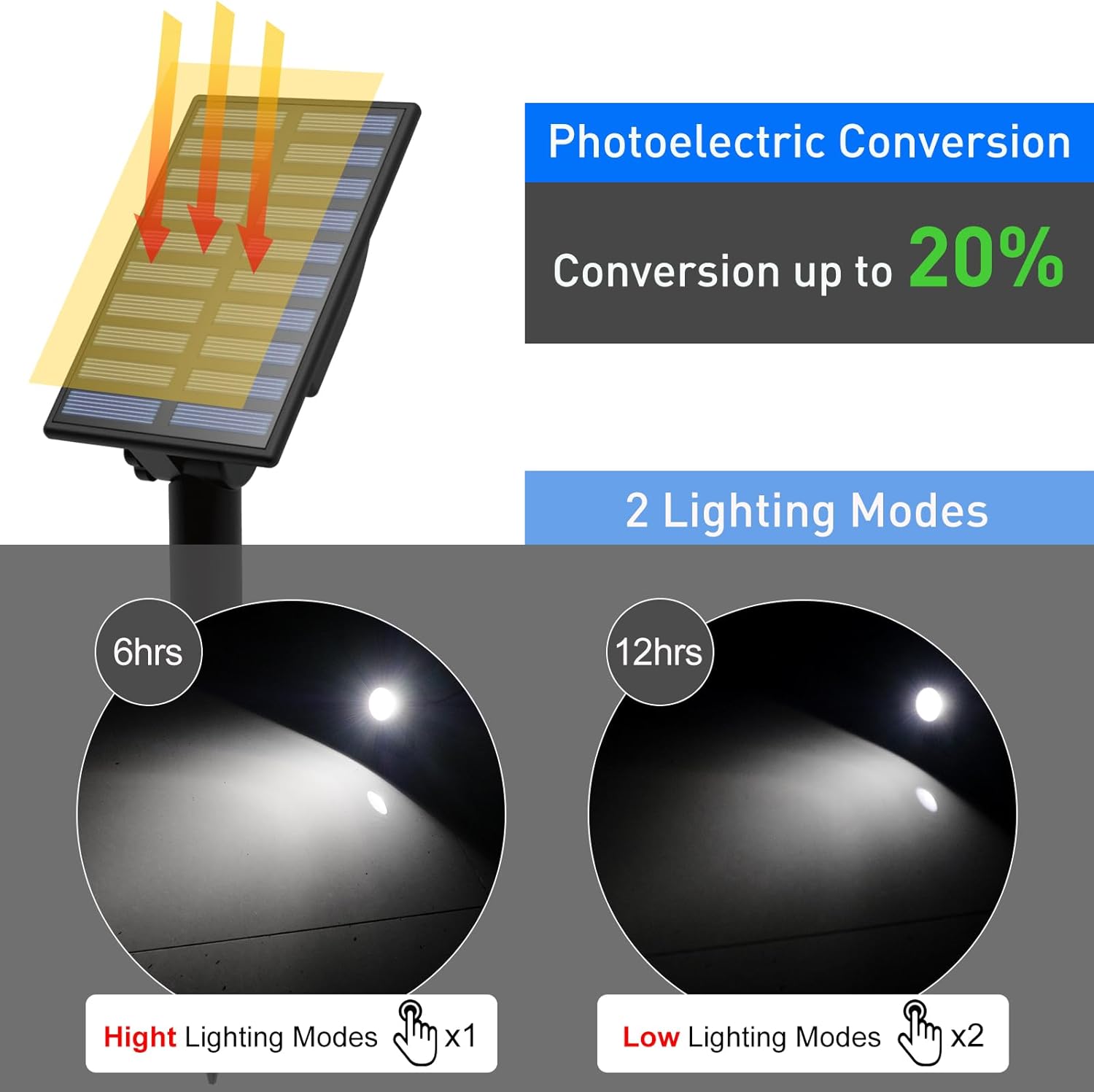• 【2 Mode & 2 Types of Installation 】 The solar spot lights have High and Low light modes, high light continuously last for 8 hours and low light for 12 hours. The solar lights can be easily inserted into the ground or mounted on the wall with included accessories, making them convenient to install and use.