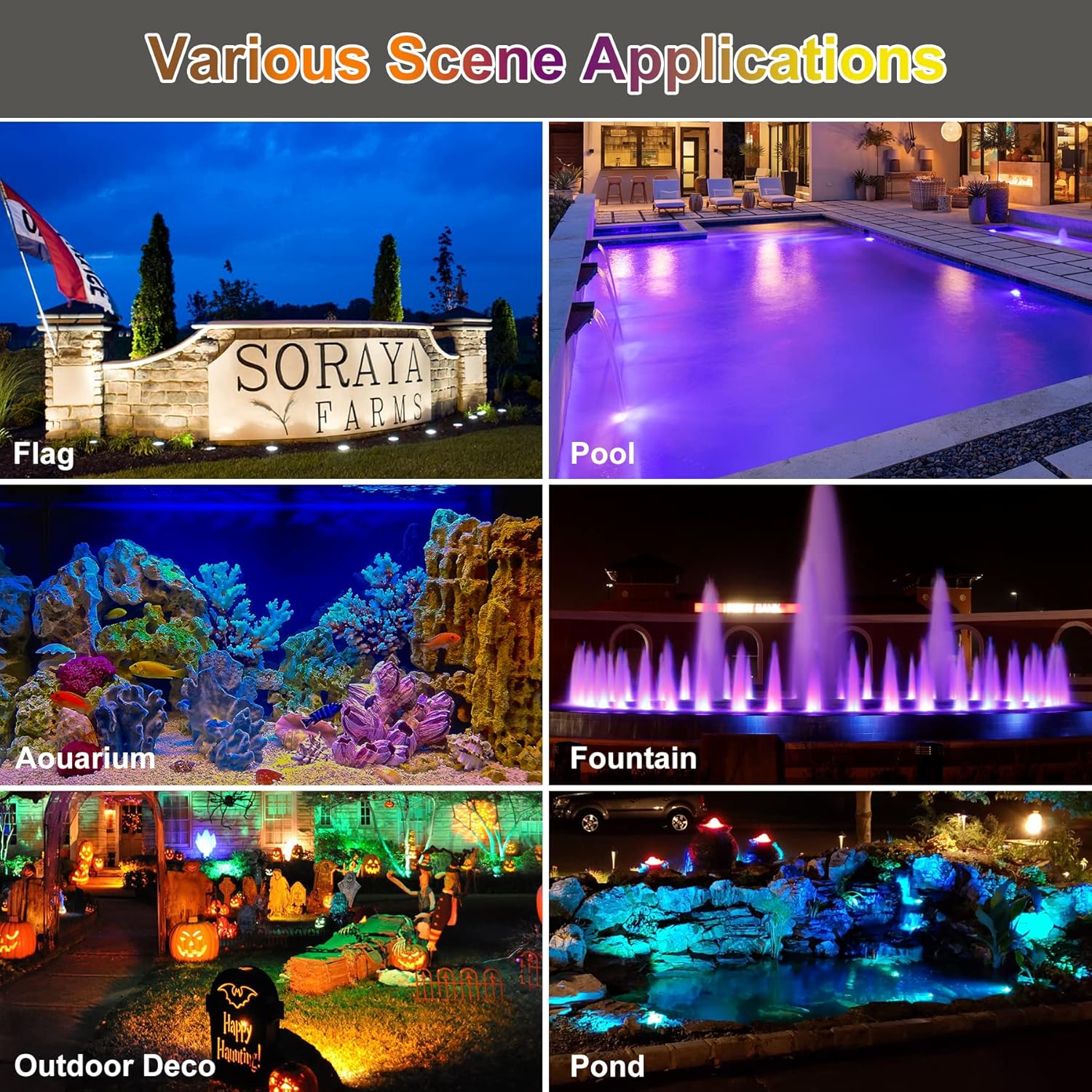 • 2 Types of Installation: Complete with accessories, the base can be fixed in the water, used as underwater lights, can also be installed on the ground or wall, used as landscape lights, either way, perfect for pool, pond, garden, path road, and other decoration & lighting