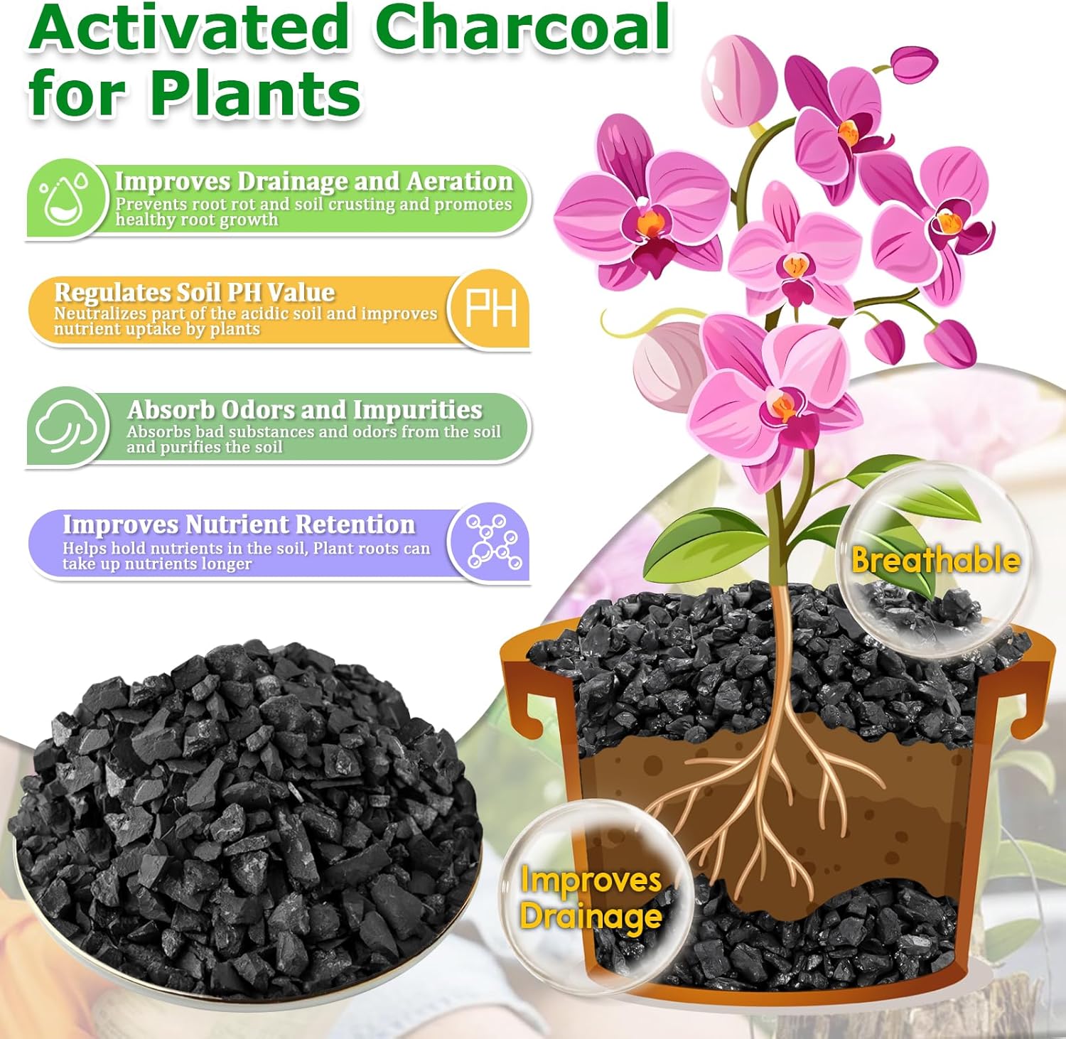• Charcoal Orchid Soil Amendment: Our horticulture charcoal is natural hardwood horticulture charcoal, which is a lightweight and mild soil additive that will assist in draining excess moisture from any container or potted plant; They are great for adding to any plant soil for drainage such as bonsai soil, orchid soil, and succulent soil