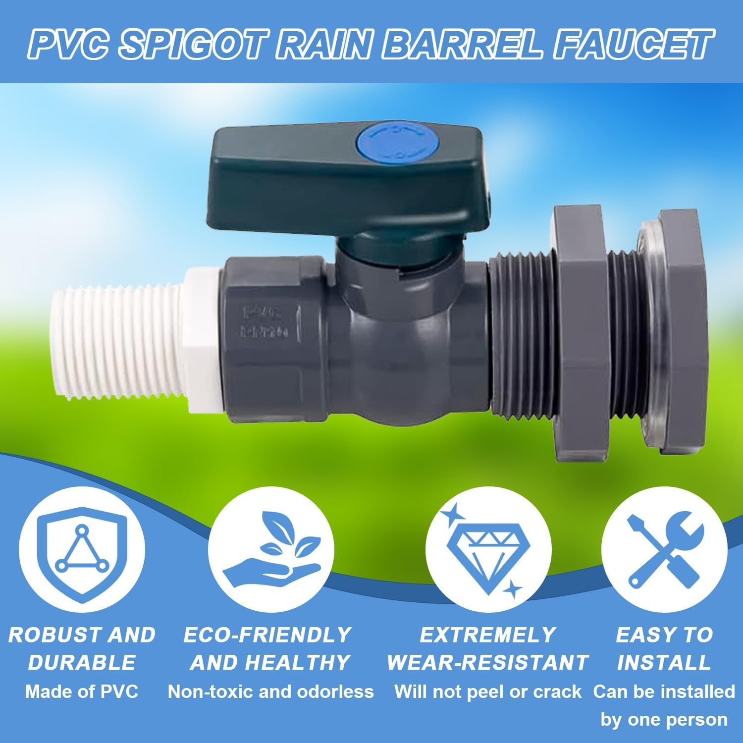 2 Pack PVC Rain Barrel Spigot Kit -3/4" Rain Barrel PVC Garden with Bulkhead Fitting Garden Hose Faucet Adapter and Thread Seal Tape for Water Tanks, Aquariums, Tubs, Pool, Garden Barrel