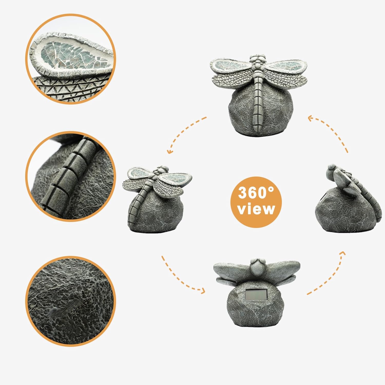 • 【Easy To Use】The patio dragonfly ornament which just toggle the bottom switchand leave it in the "on" position in the daytime.The solar dragonfly sculpture charge during the day and light up automatically at night.If the led lights don't turn on when you receive it that maybe caused by the long time shipping.Just place dragonfly in the sunlight for a few hours,and the problem will be fixed.