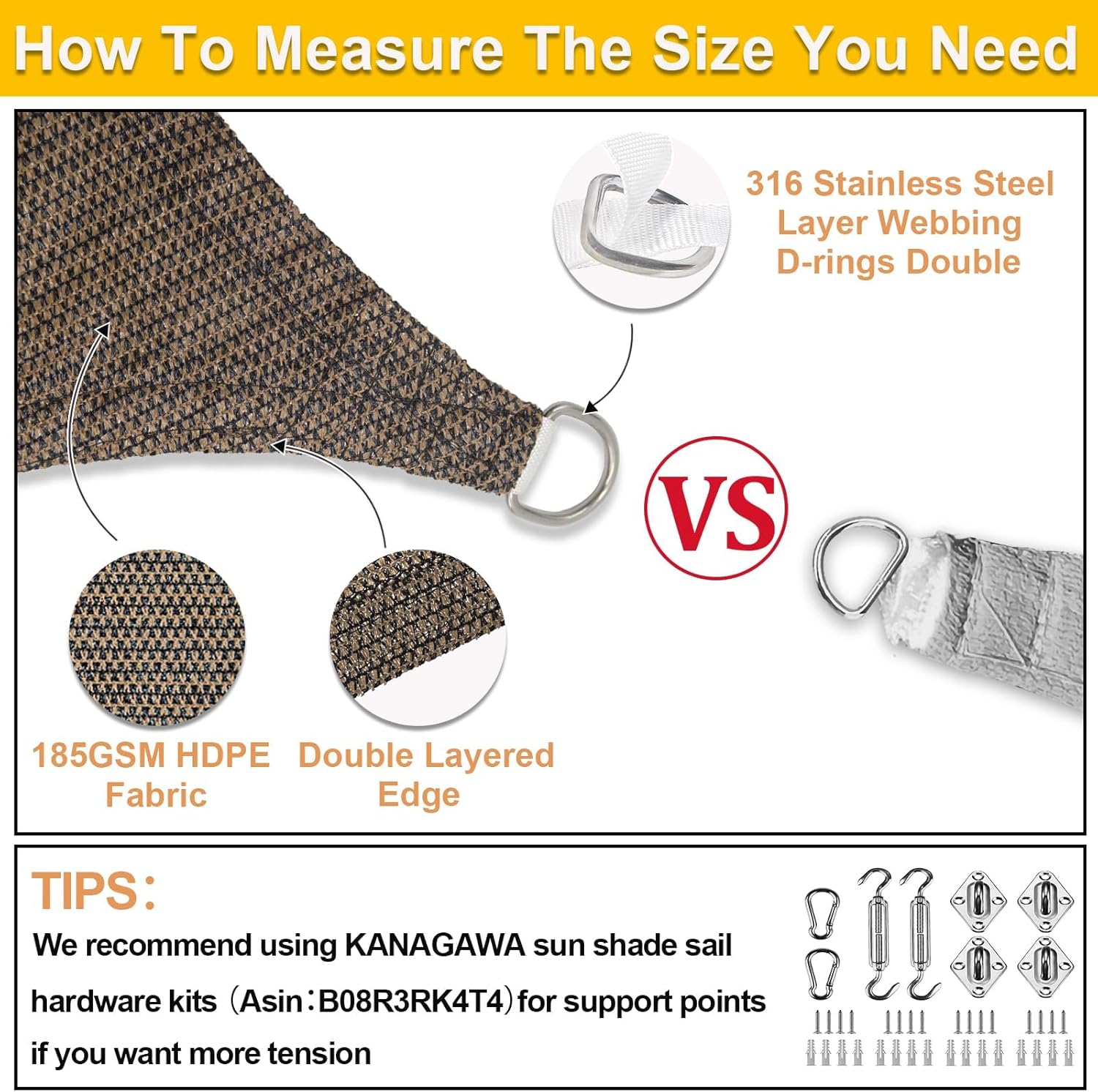 • High Quality Materials: Made of 100% brand new 185 GSM HDPE (high density polyethylene) material.Our sunshade sail is attached with DOUBLE layer webbing in each side and stainless steel D rings in corners to make the sun sail shades stronger and more durable