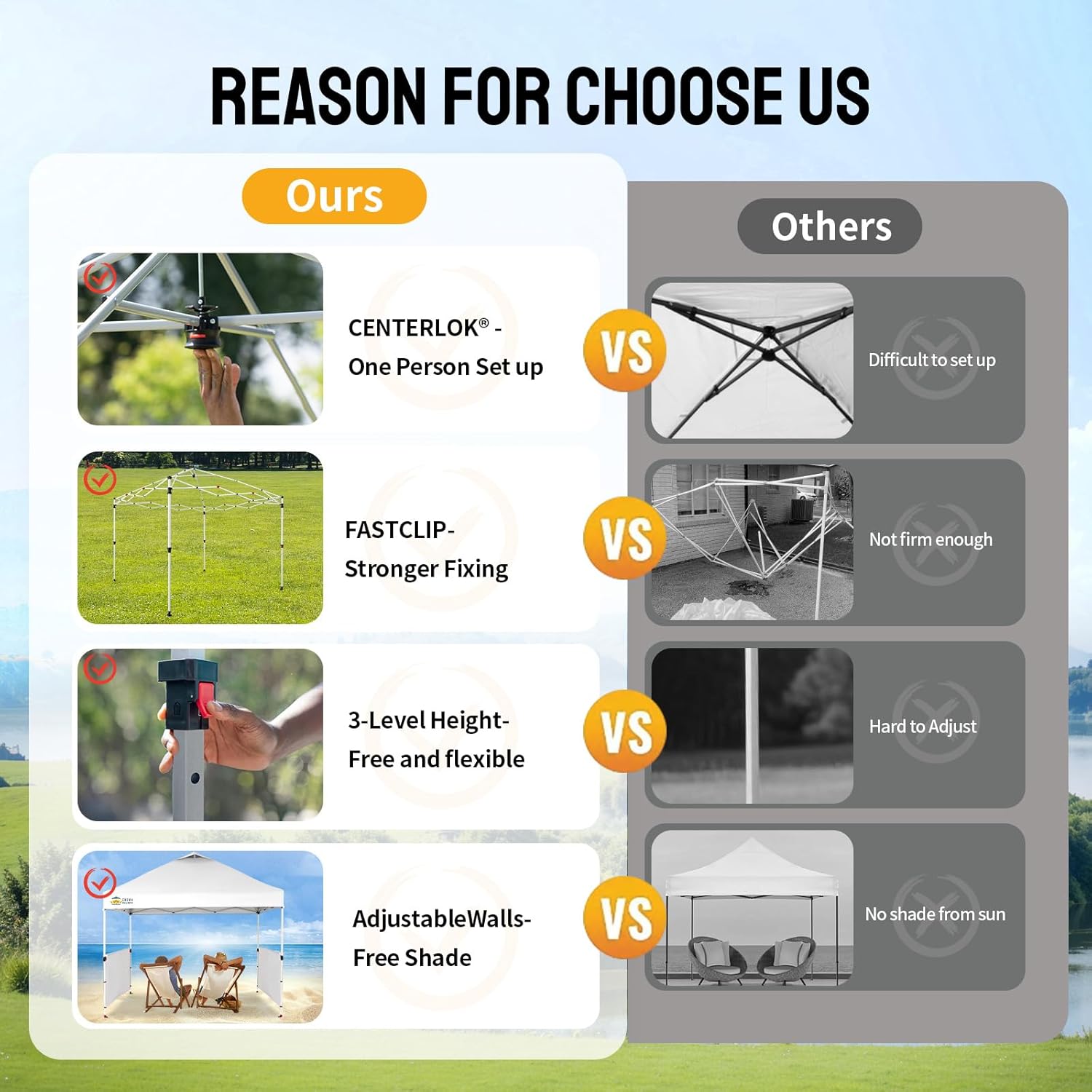 • [EASIEST SET UP]: Patented one push center lock technology – central hub locks out all four legs with a single push. Then use the soft pinch-free buttons to set the leg height. The new generation canopy designed so two people can set it up in seconds with no tools necessary.