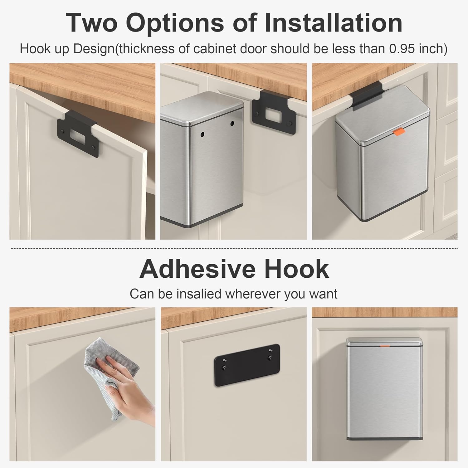 • 【WALL MOUNTED/COUNTERTOP/ UNDER SINK TRASH CAN】: No need to bend over. The trash can provide Two opening and installation methods,Effortless and Fits for Most Cabinet Doors, Pantry Doors. The thickness of door should be less than 0.98" (2.5cm). Small trash can can also be glued on kitchen or bathroom wall or under the sink.
