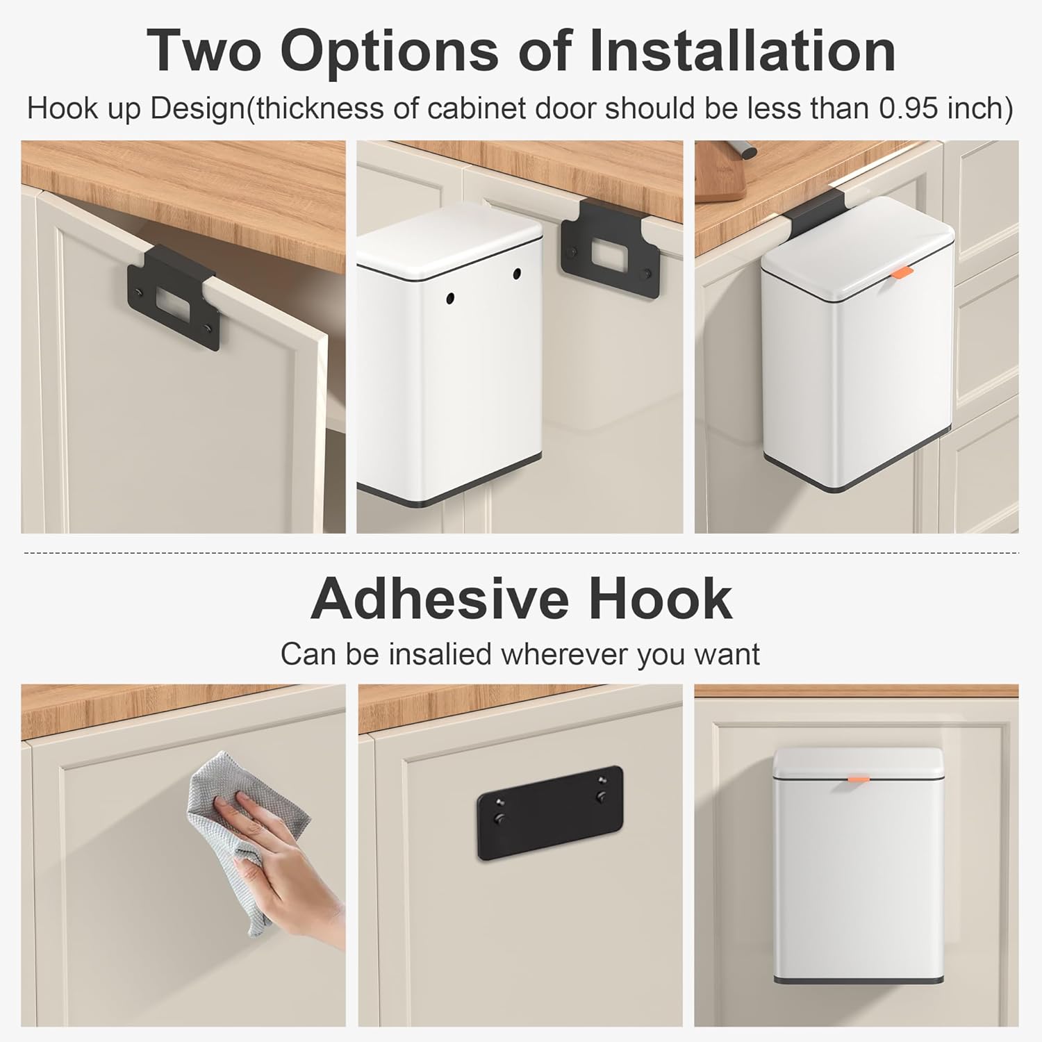 • 【WALL MOUNTED/COUNTERTOP/ UNDER SINK TRASH CAN】: No need to bend over. The trash can provide Two opening and installation methods,Effortless and Fits for Most Cabinet Doors, Pantry Doors. The thickness of door should be less than 0.98" (2.5cm). Small trash can can also be glued on kitchen or bathroom wall or under the sink.