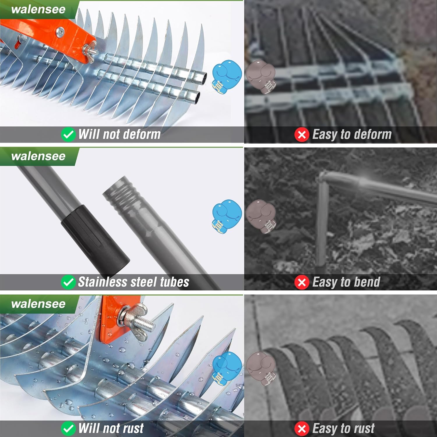 • Maintaining Lawn Health and Aesthetics: The Walensee Thatch Rake is designed to effectively remove thatch layers, and it can also assist you in cleaning up fallen leaves, branches, and other debris from your lawn. This allows the lawn to absorb air and sunlight more effectively, promoting its healthy growth and keeps your lawn neat and tidy. The ergonomically designed handle provides sufficient leverage, making it easy to clear dead grass and relieve your back strain.