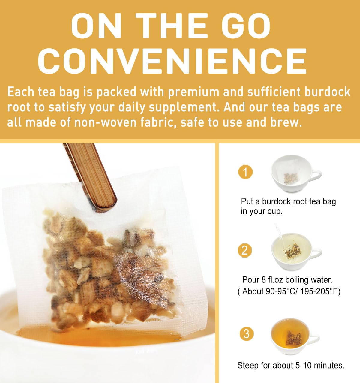 • EASY TO USE: 60 burdock root tea bags are placed in a resealable bag to keep them fresh. Just take one and place it in the cup, add 8 fl.oz of boiling water. Steep for about 5-10 minutes. Take out the tea bag then enjoy this burdock root tea;