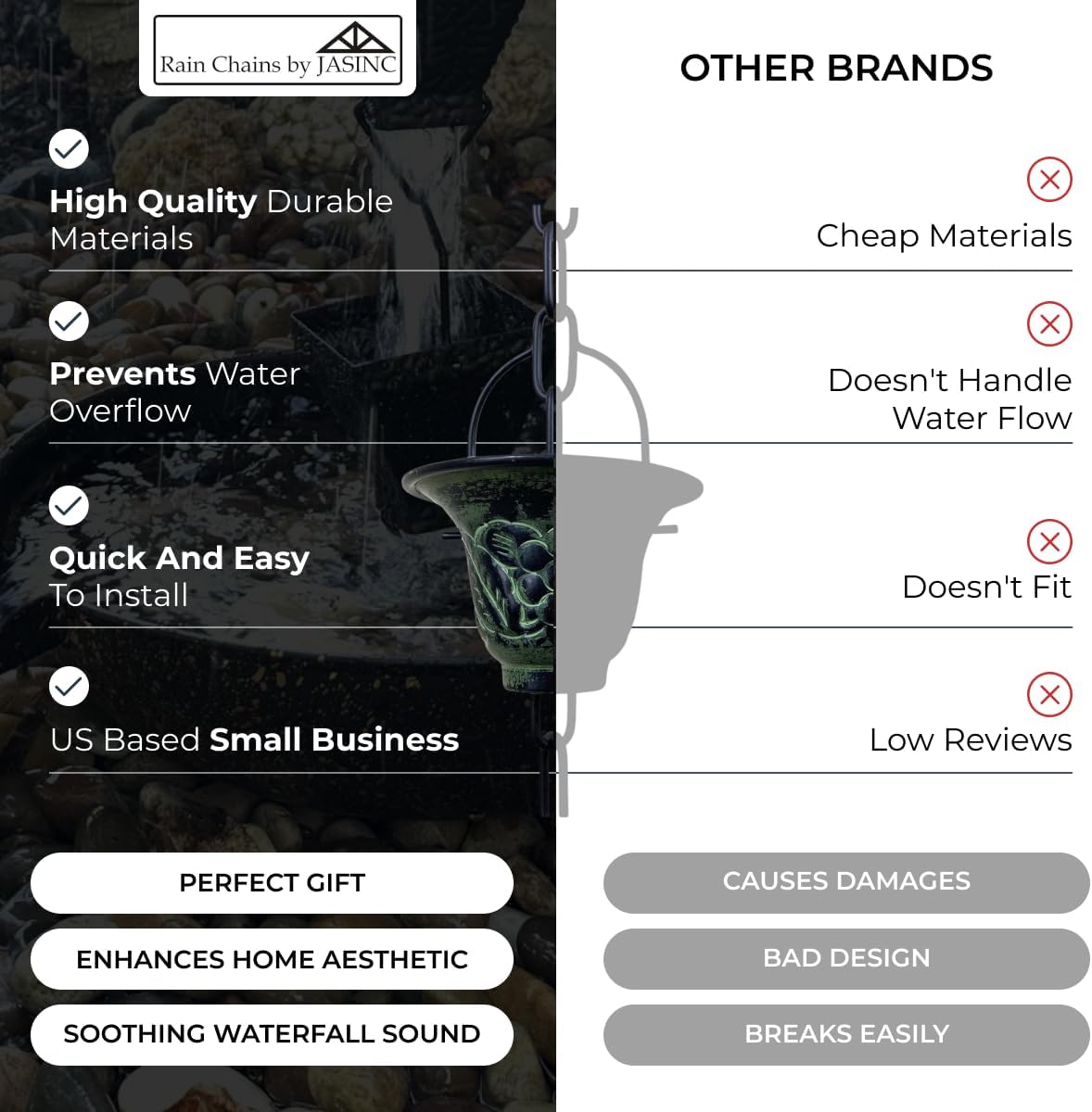 • RAIN CHAINS BY JASINC QUALITY ASSURANCE: we use only top quality materials for all our rain chains and accessories. We focuses on preventing defects, enhancing reliability, and maintaining customer satisfaction through continuous improvement.