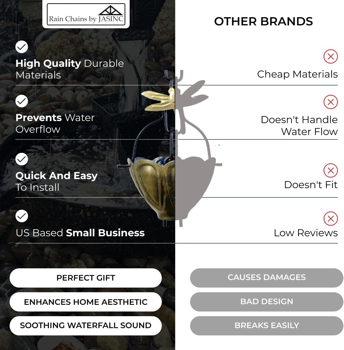 • RAIN CHAINS BY JASINC QUALITY ASSURANCE: we use only top quality materials for all our rain chains and accessories. We focuses on preventing defects, enhancing reliability, and maintaining customer satisfaction through continuous improvement.
