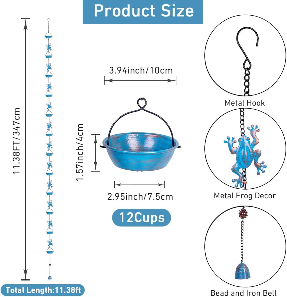 • Stylish Design: The rain catcher chain is blue and golden, consisting of 11 cute frogs and 12 cups. You can enjoy the amazing scene of rain flowing down the rainchains, without worrying about it splashing everywhere, because of the design of the wide cup
