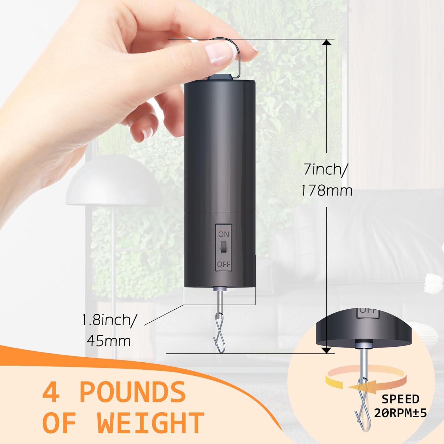 • 【Compact size】5.11in long ,1.69in diameter;Light weight:0.14 kg,Compact size with exquisite structure,easily to hang up to save place.Medium Revolving speed,approximately 30+/-5 RPM depending on battery power and item weight,the rotating speed of this small ornament motor can perfectly spin your hanging decor to show the cool reflective visual effect.