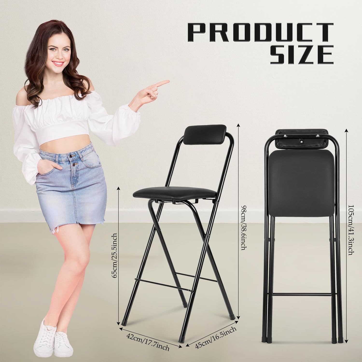 • Versatile Use: our foldable stools are truly multifunctional pieces of furniture, folding chair with backrest can be applied in kitchen, dining room, bar counter, study room, balcony, cafe, office lounge area; Whether you need additional seating in your kitchen, dining room or home office, or want to create a cozy nook on your balcony or cafe, our counter height chairs can meet your needs in a variety of ways