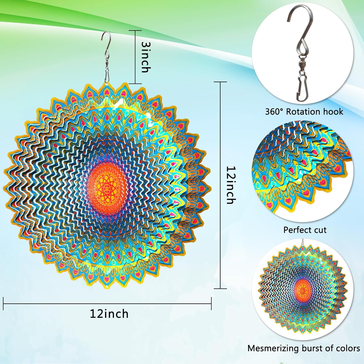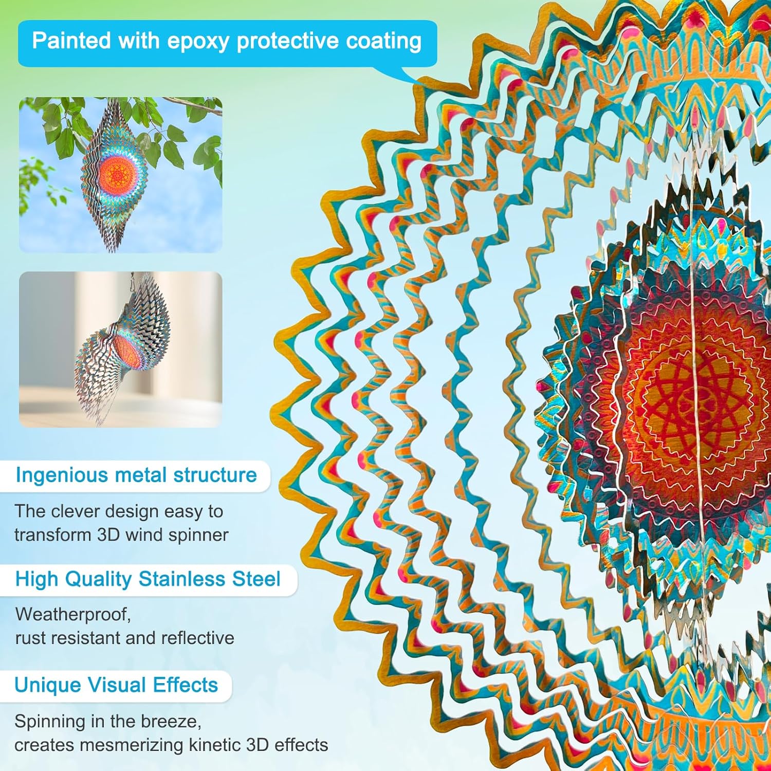 • 【Kinetic 3D Wind Spinner】The kinetic 3D mandala wind spinner has a stunning 3D mandala design that the unique flow of light surface adds vibrant colour and movement! This kinetic art metal wind spinner will add charm to your garden or yard.