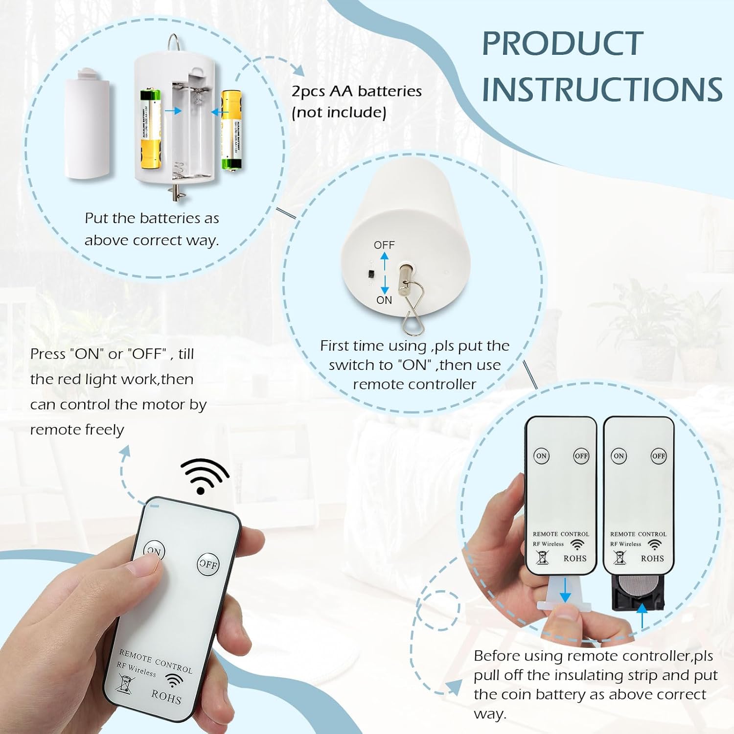• 【Easy to use】First time using ,pls put the switch to "ON",then use remote controller.Remote Controller can conveniently turns on and switch off the motor,gives a simple and easy way to get your hanging decor moving or stopping,while anywhere your hanging decor hang you desire.