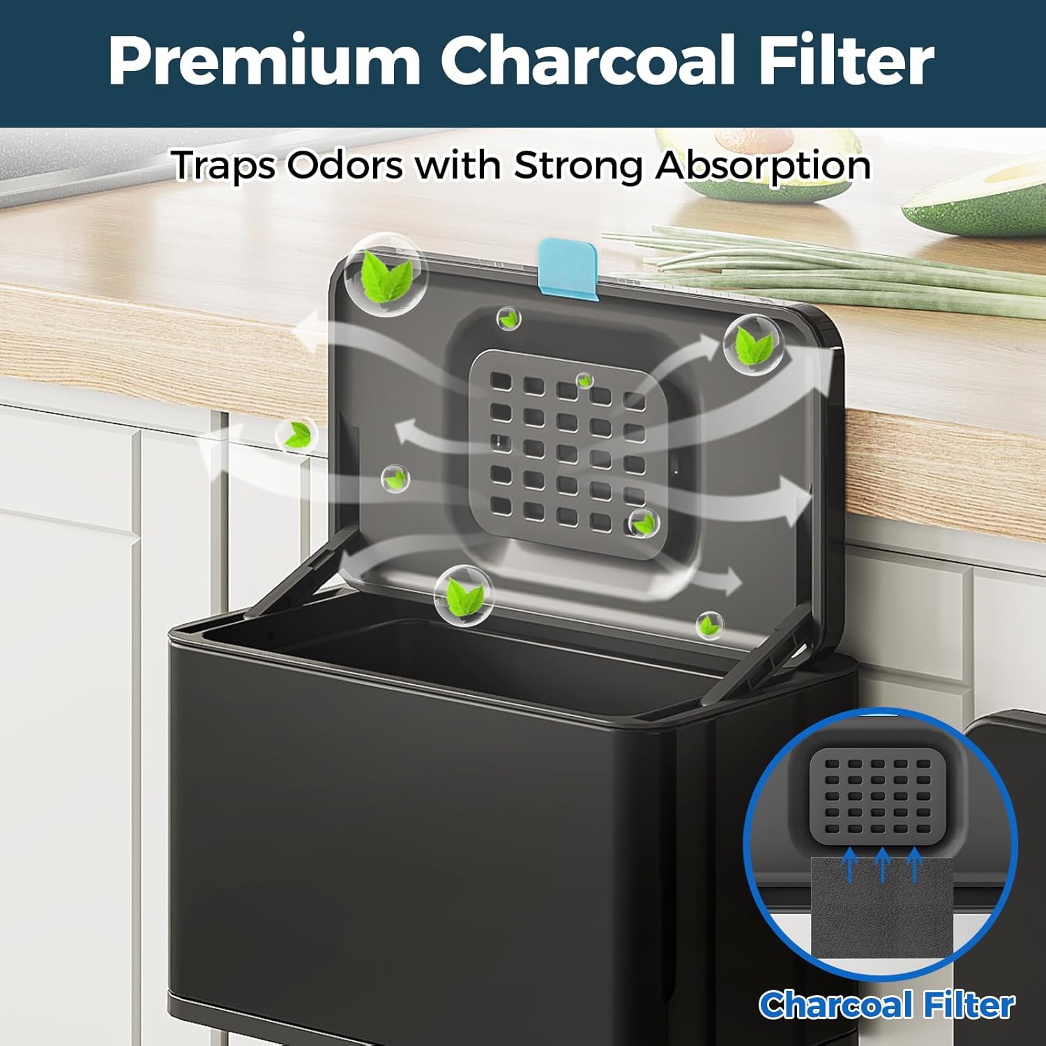 • Odor Absorbing Filter - The activated-charcoal filter included inside this trash can (NOT in other brands) traps and absorbs odors without leaking funky smells. Stainless steel trash can with lid enhances the sealing effect, specifically designed to hide smelling and fruit fly free.