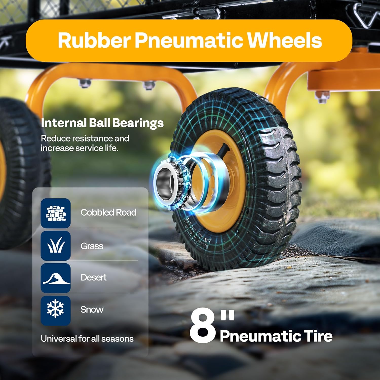 • IMPACT-PROOF TIRES - The load-bearing, shock-absorption, and noise-reduction of the cart are all determined by the casters; Compared with small wheels, four 8’’ pneumatic tires allow for easy maneuverability on rough terrain; The tread pattern of tires increases the friction with the ground; PLEASE BE AWARE that the tires should not be fully inflated due to safe transport consideration
