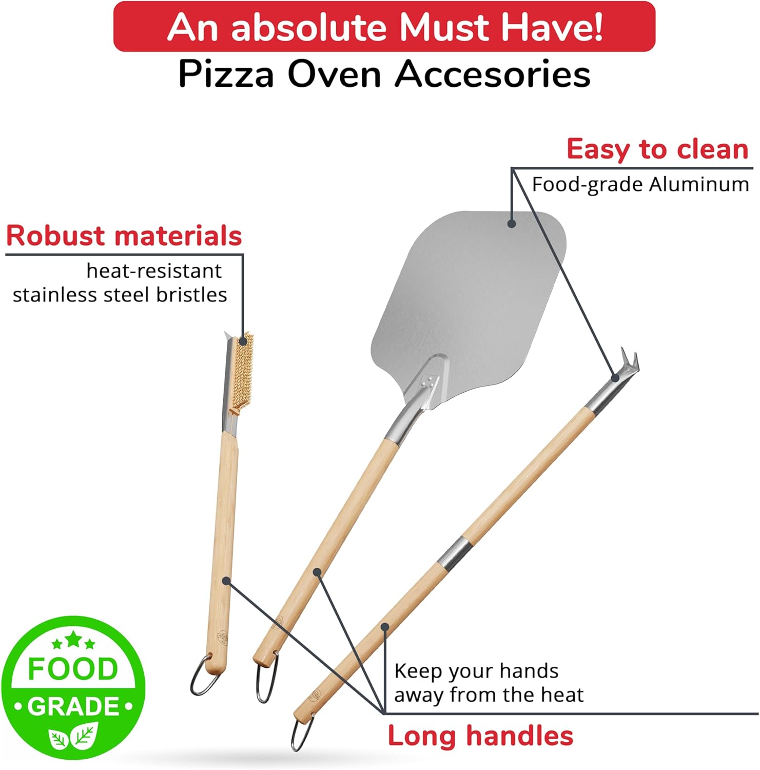 Pizza Oven Accessories Set - 3 Piece Pizza Making Kit with Pizza Peel, Pizza Oven & Stone Brush with Scraper, Turning Fork & Bubble Popper - Tools for Indoor Outdoor Brick Wood Gas Ovens