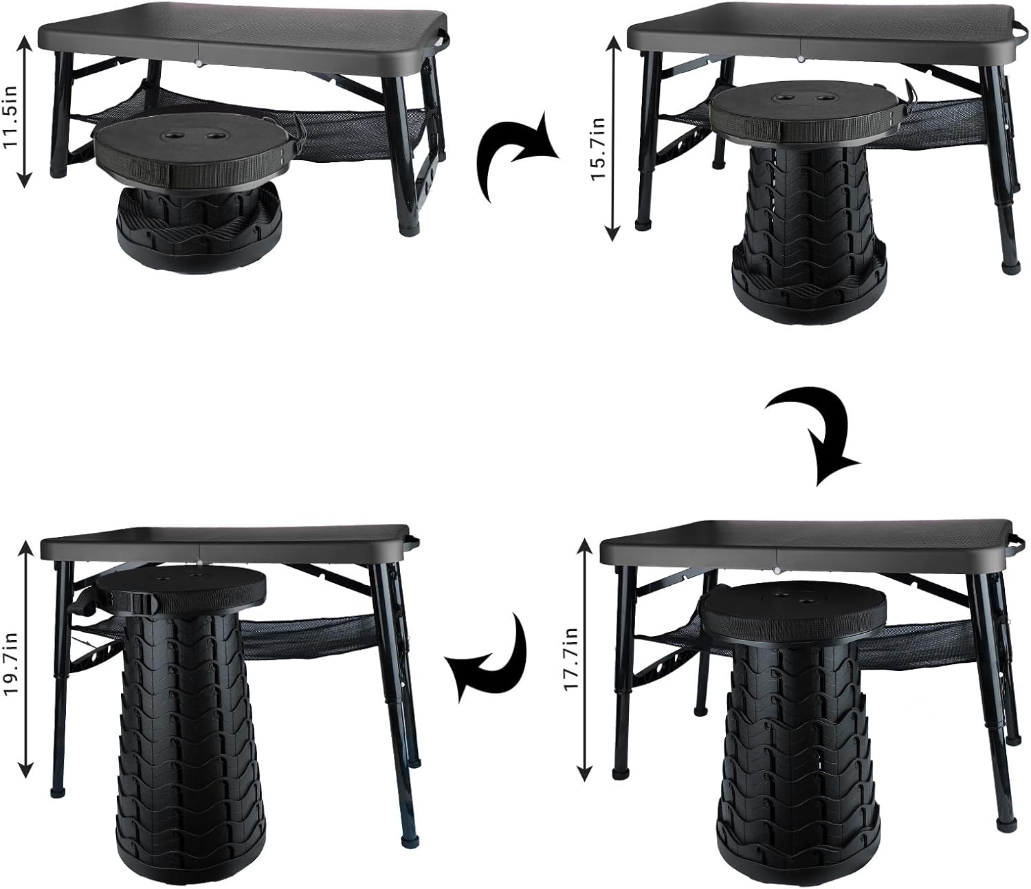 • 2-In-1 Camping Table And Stool: This folding camping tables and telescopic stool chairs can help you go out anytime and anywhere. The collapsible stool can be completely put into the foldable tables, and it is equipped with a handle outside the folding camp side tables. The material is high-quality plastic, it opens very smoothly and will not get stuck like aluminum products, even kids and women can easily open and close.