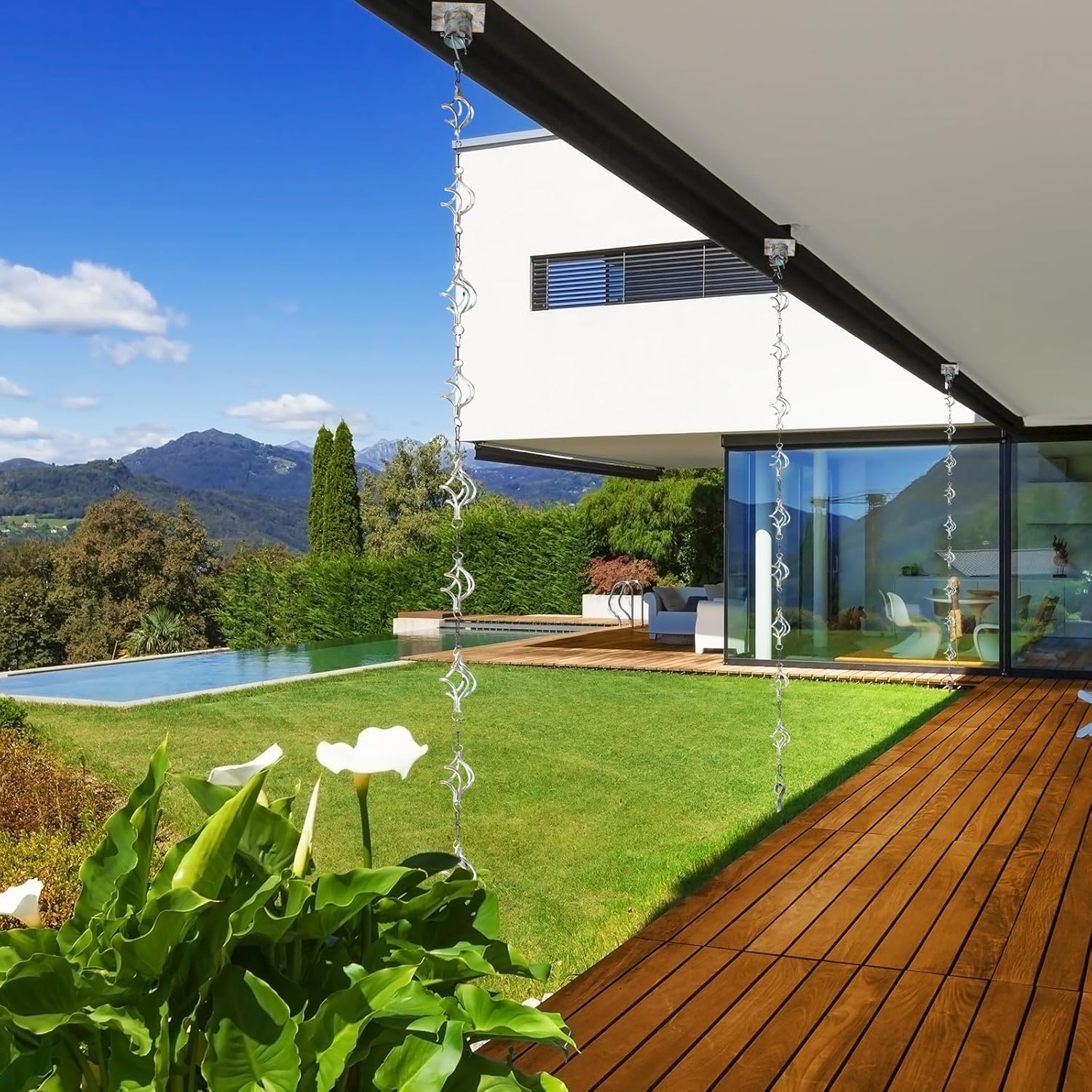 • Rain chain Easy to Hang: It includes an additional 3.9" wide hanger and an anchoring stake to easily remove these rain chains from any tree, window pane or patio, or set them on your drain, or hang them in a place where they can handle large amounts of water