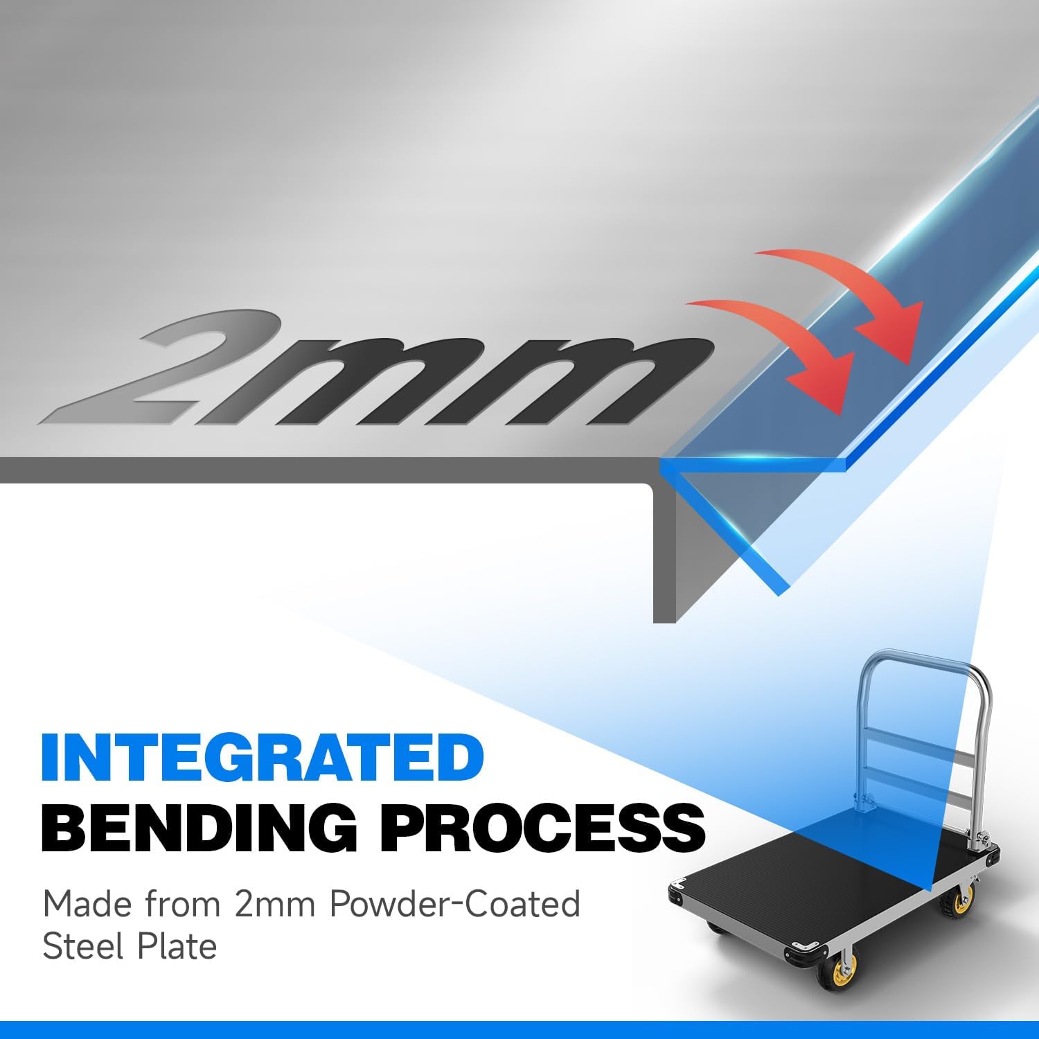 • Non-slip Mat & Durable: Anti-collision bars have been added to the four corners of the platform dolly to prevent collisions that might affect your feet. The included rubber mat not only protects the cart's surface but also prevents items from slipping, ensuring a secure transport experience. The platform truck's border and bottom are fortified with multiple bends, adding structural reinforcement for enhanced stability during use.