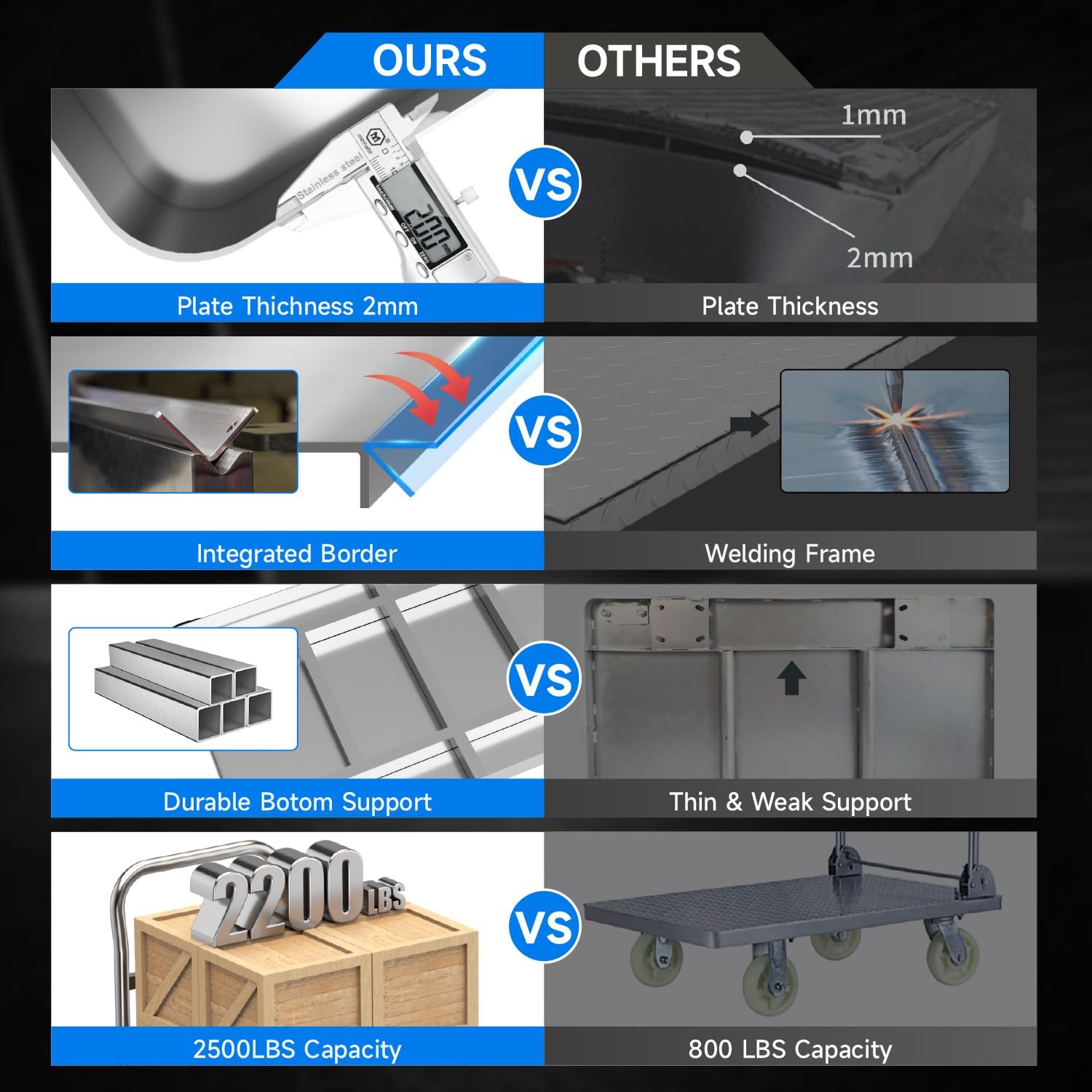• 2200 LBS Load Capacity: Crafted from robust 2mm thick steel plates, the platform truck's main body employs integral bending for enduring construction that withstands heavy loads and wear. Engineered with a reinforced bottom support, our platform truck ensures even weight distribution, preventing sagging, and reliably carries substantial loads up to 2200 lbs. Count on this cart for dependable performance, whether it's heavy equipment or bulk items.