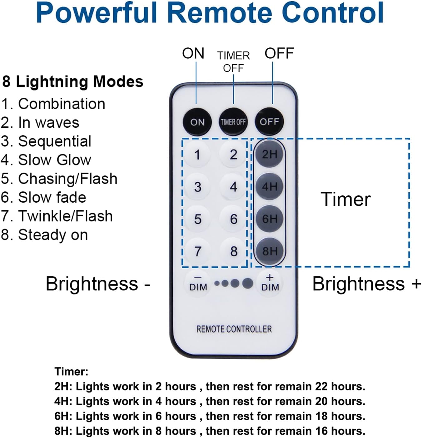 • 8 Lighting Modes: This holiday decorative string light has 8 lighting modes for you to choose: combination, in waves, sequential, slogs, chasing/flash, slow fade, twinkle/flash, and steady on. Fit different occasions and environment, adjust the lighting modes by using remote control or pressing the round button on the black mode controller box
