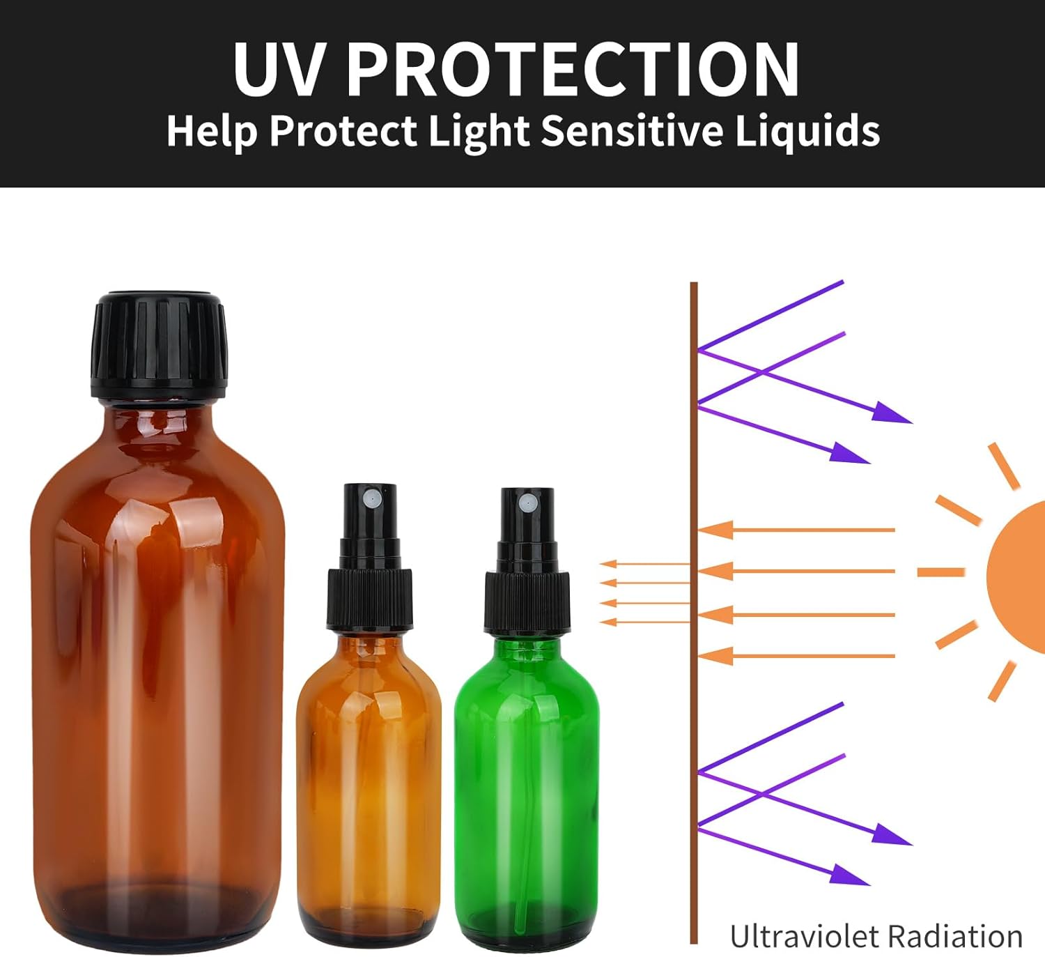 • What You Get - 1 8.4oz/250ml glass spray bottle, 1 2oz/60ml amber spray bottle, 1 2oz/60ml royal blue glass bottle, 1 Funnel, 1 Dropper, 1 cap for 8.4oz/240ml bottle.