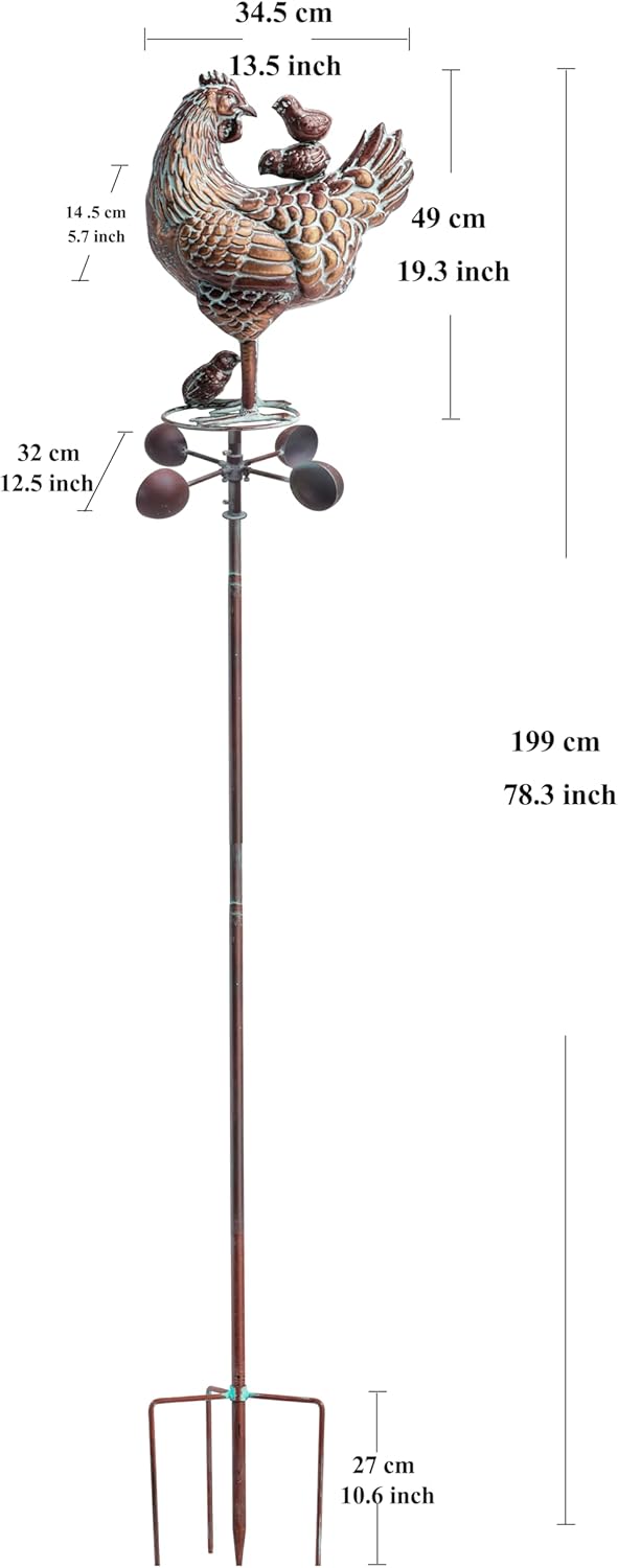• Metal Chicken Hen and Chicks Wind Spinner for Yard and Garden - The chicken sculpture garden stake measures 78" H x 13.5" L x 12.5" W. This vintage-style vintage metal chicken decoration not only enhances your gardening decor but also serves as a conversation starter, making it a unique addition to outdoor. Perfect decorative accent piece to enhance rustic, country, or farmhouse style outdoor interiors
