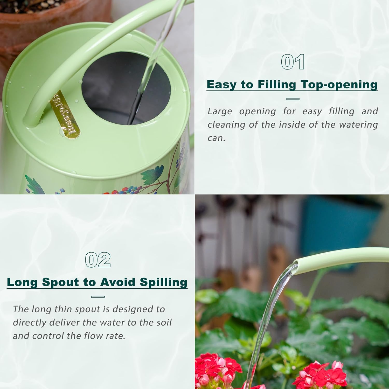• [HIGH-QUALITY STAINLESS STEEL: This watering can is made of stainless steel. After many polishing surfaces, the smooth texture can resist daily scratches, corrosion and is not easy to rust. The curved handle with no sharp edges makes it easy and comfortable to carry around one-handed even full. The welds around the bottom of the spout and around the two points where the handle connects to the body are attached well to prevent it from leaking.