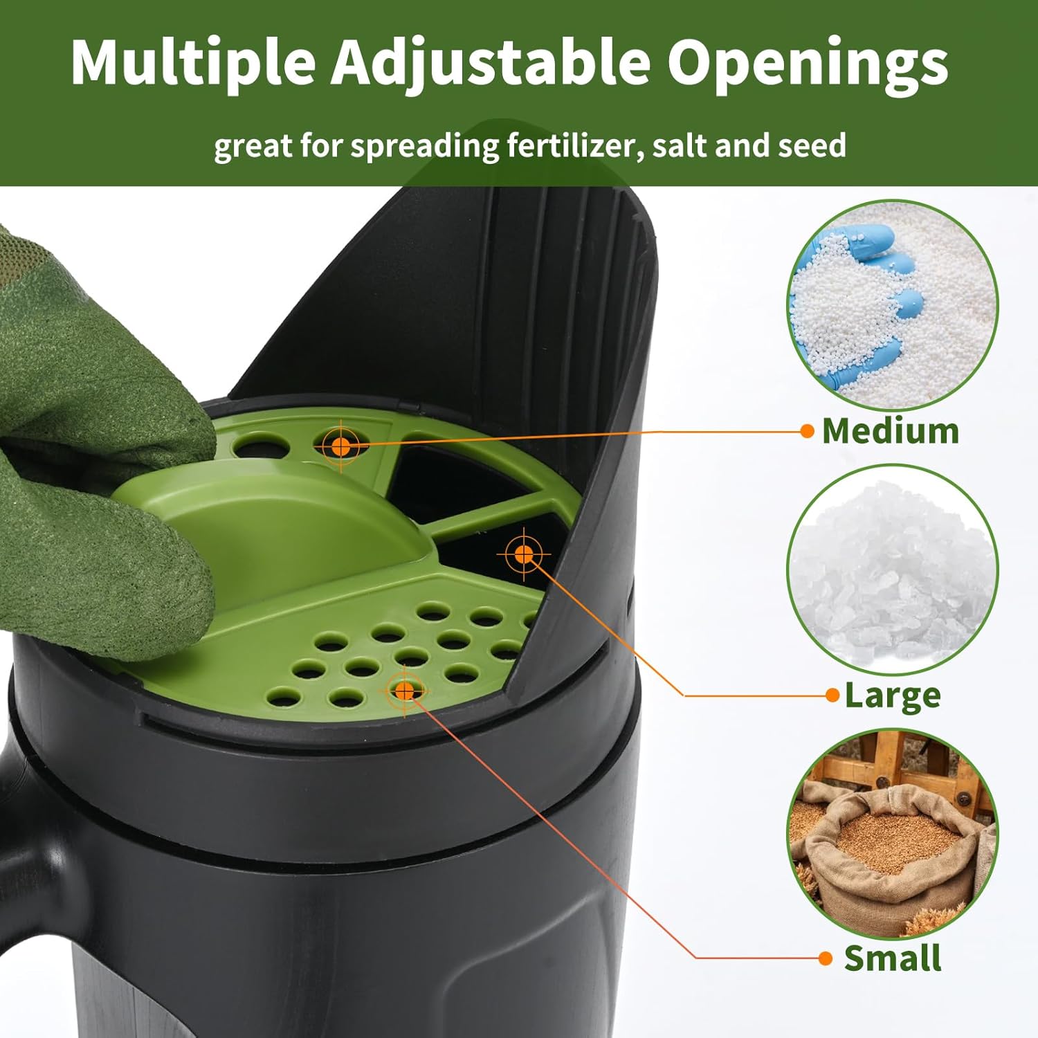 • Efficient Use : No more over spray and waste. The front of the lid helps distribute the granules more slowly and evenly. The salt and seed shaker features a large capacity of 80oz. Just Twist open the lid, fill the hand spreader, screw back the lid and get your job done without struggling to refill it time and again.
