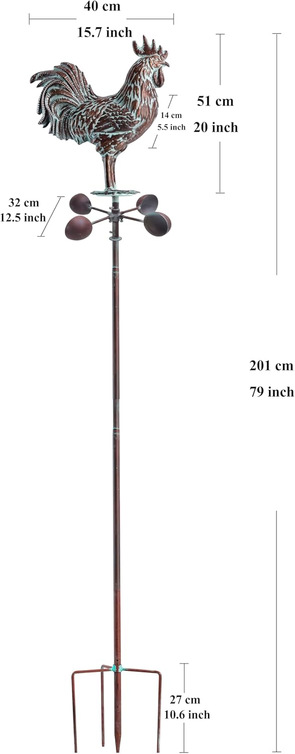 • Metal Chicken Rooster Wind Spinner for Yard and Garden - The rooster sculpture garden stake measures 79" H x 15.7" L x 12.5" W. This vintage-style vintage metal chicken decoration not only enhances your gardening decor but also serves as a conversation starter, making it a unique addition to outdoor. Perfect decorative accent piece to enhance rustic, country, or farmhouse style outdoor interiors