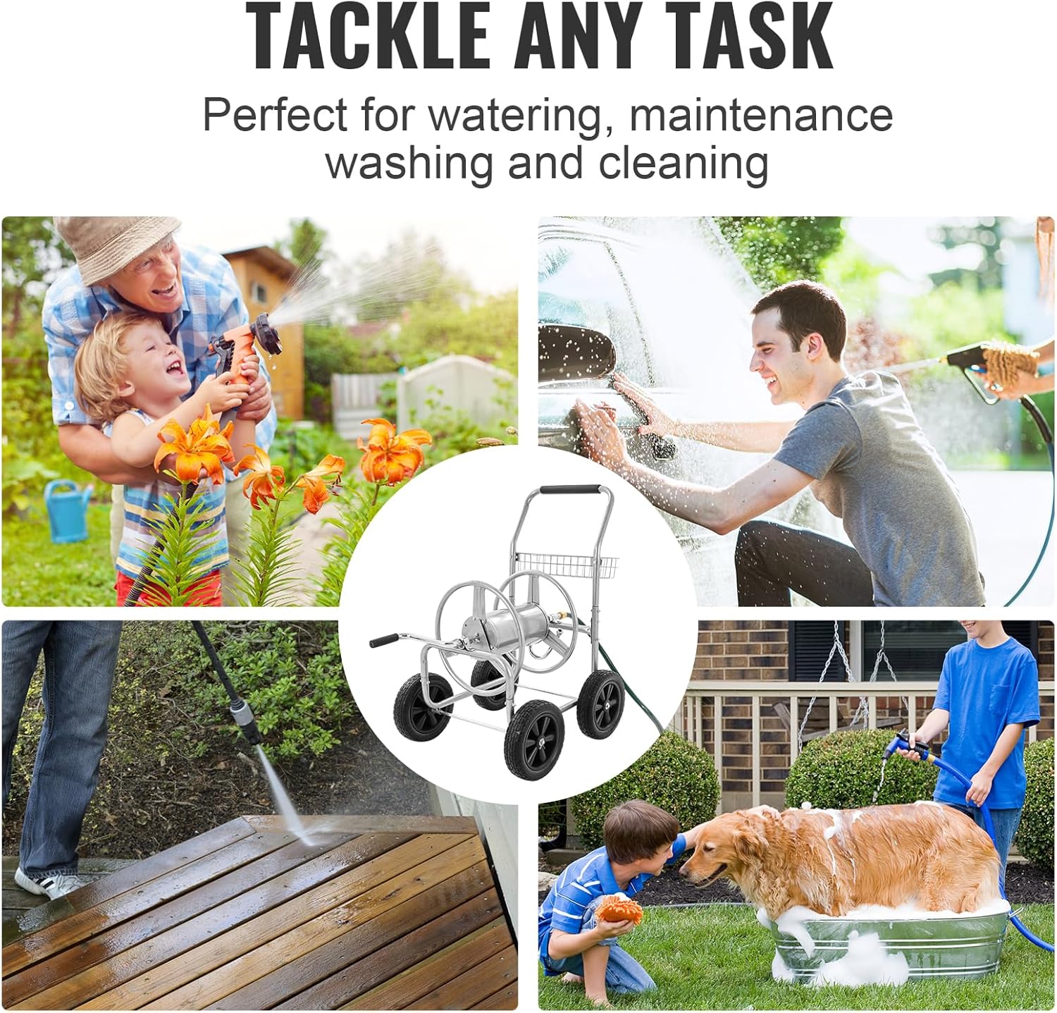 • Versatile Application: The water hose reel cart is widely used in residential gardens for various purposes such as watering plants, maintaining lawns and grassy areas, irrigation in agriculture and farming, vehicle washing, general cleaning, and other outdoor activities.