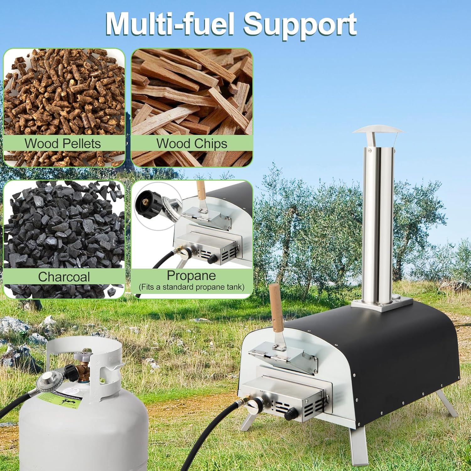 • 【Multi-fuel Support】: This pizza oven distinguishes itself by dual fuel burner design, including both propane and combustion fuels. The gas burner fits a standard propane tank for sustained heating. Plus, it works well with wood pellets, wood chips and charcoal to keep the original flavor of food. (Gas burner needs one AAA battery, which is not included in the package.)