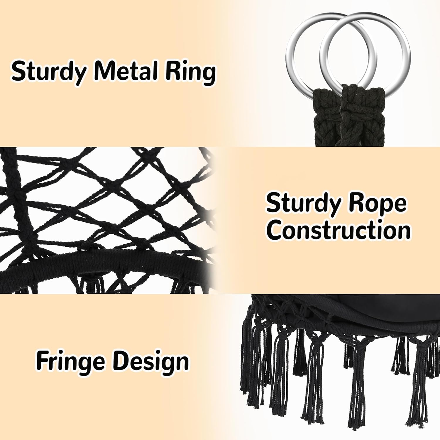 • 【SOLID STEEL FRAME】Our macrame hammock swing chair frame is a single piece of powder coated steel, unlike other products which require complicated assembly of the frame