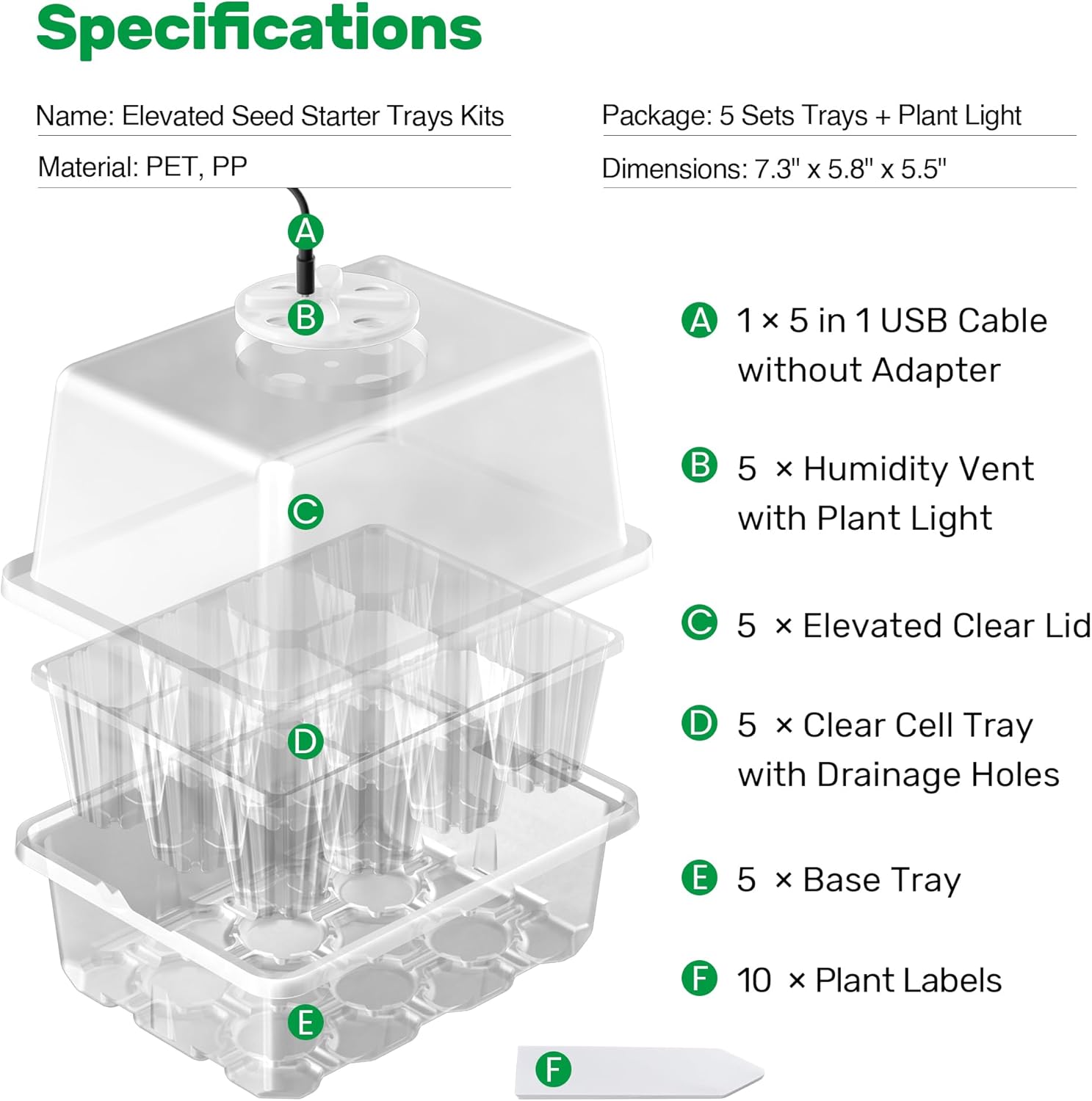 • 🌱【Comprehensive Package】: This set includes everything you need to kick-start your gardening journey – 5 clear seed trays, 5 clear base trays, 5 elevated humidity domes, and 5 adjustable vents with built-in plant lights.