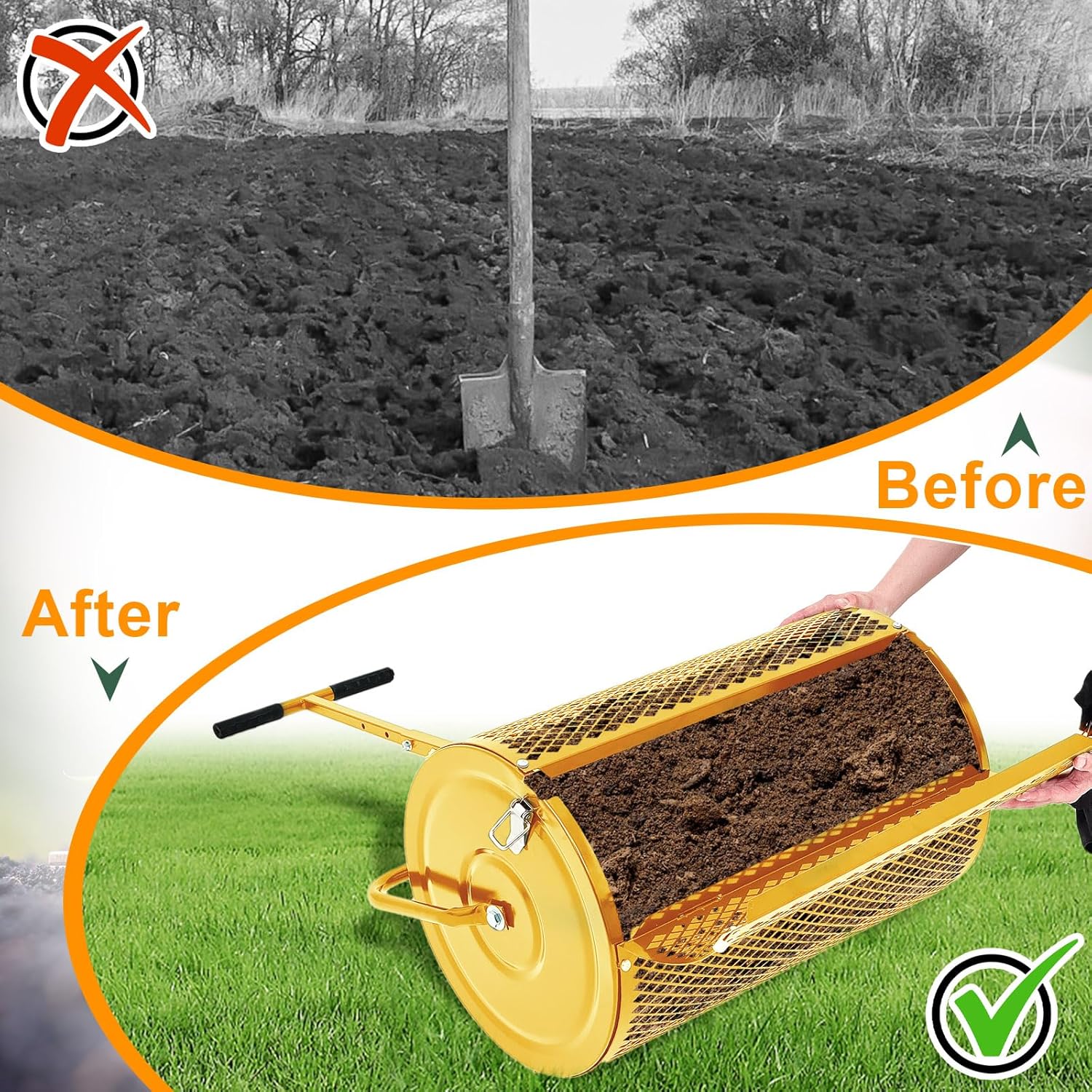 • Quick and Easy Lawn Care: 0.4 x 0.8 inch mesh holes allow product to break up lumpy material when rolled and spread peat moss, topsoil, compost, mulch evenly and quickly on lawns, patios, gardens, help to reduce waste and save costs, compared with traditional shovels, it can well improve efficiency