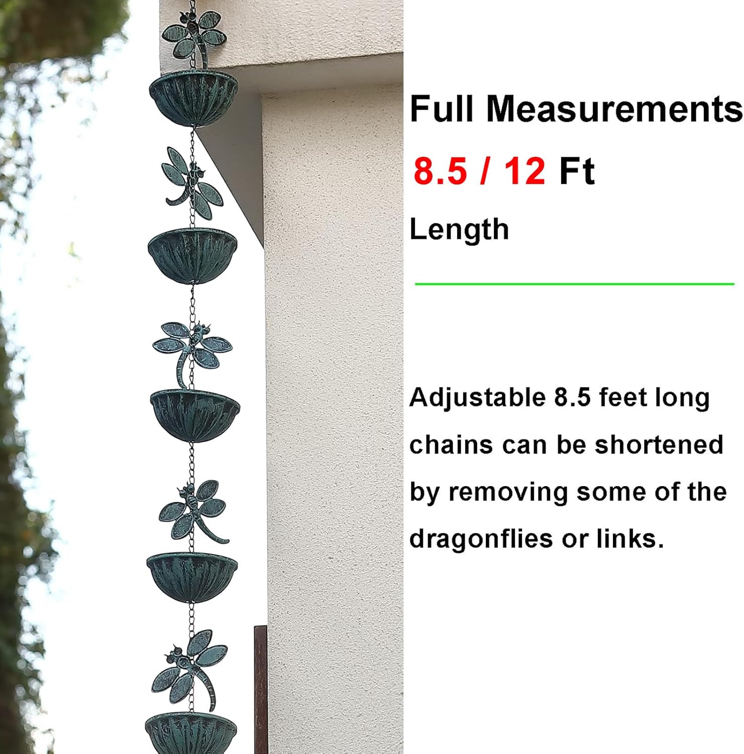 • This rain chain features 14 antique blue cup with detailed dragonflies sculpture