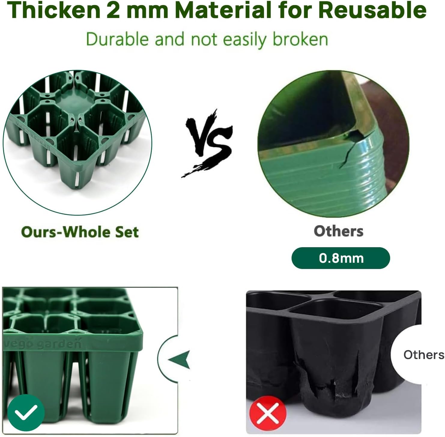 • Vego Garden seedling trays use 2mm PVC material, stronger and not easy to deform, can be reused many times. The thickened bottom edge material that can withstand the pressure, it would not lose soil or soak up too much water, and effectively cultivate seeds