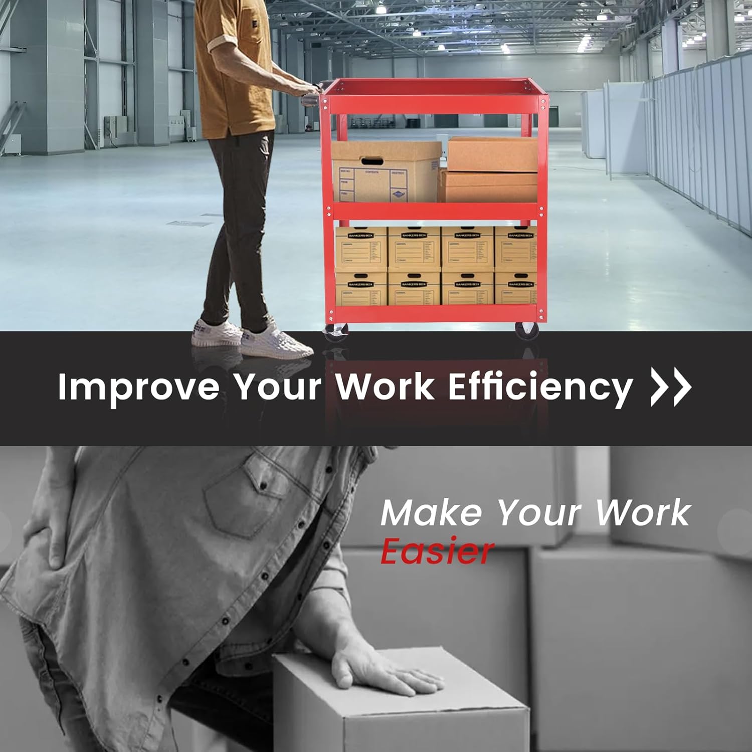 3-Tier Commercial Utility Cart with Brake Wheels, Sturdy Steel Construction, 110 lbs Capacity, Red