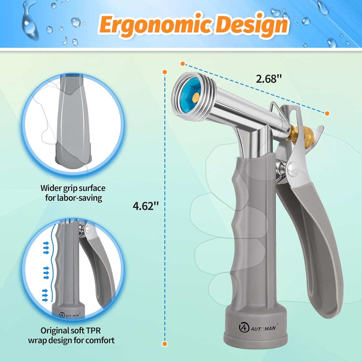 • UPDATED ERGONOMIC DESIGN FOR COMFORT: Compared to traditional full-size pistol grip hose nozzles, we have added a thick layer of TPR wrapping to the all-metal body for enhanced comfort. The cushioning effect on your knuckles ensures a pleasant user experience, making it a tool you'll love to use!