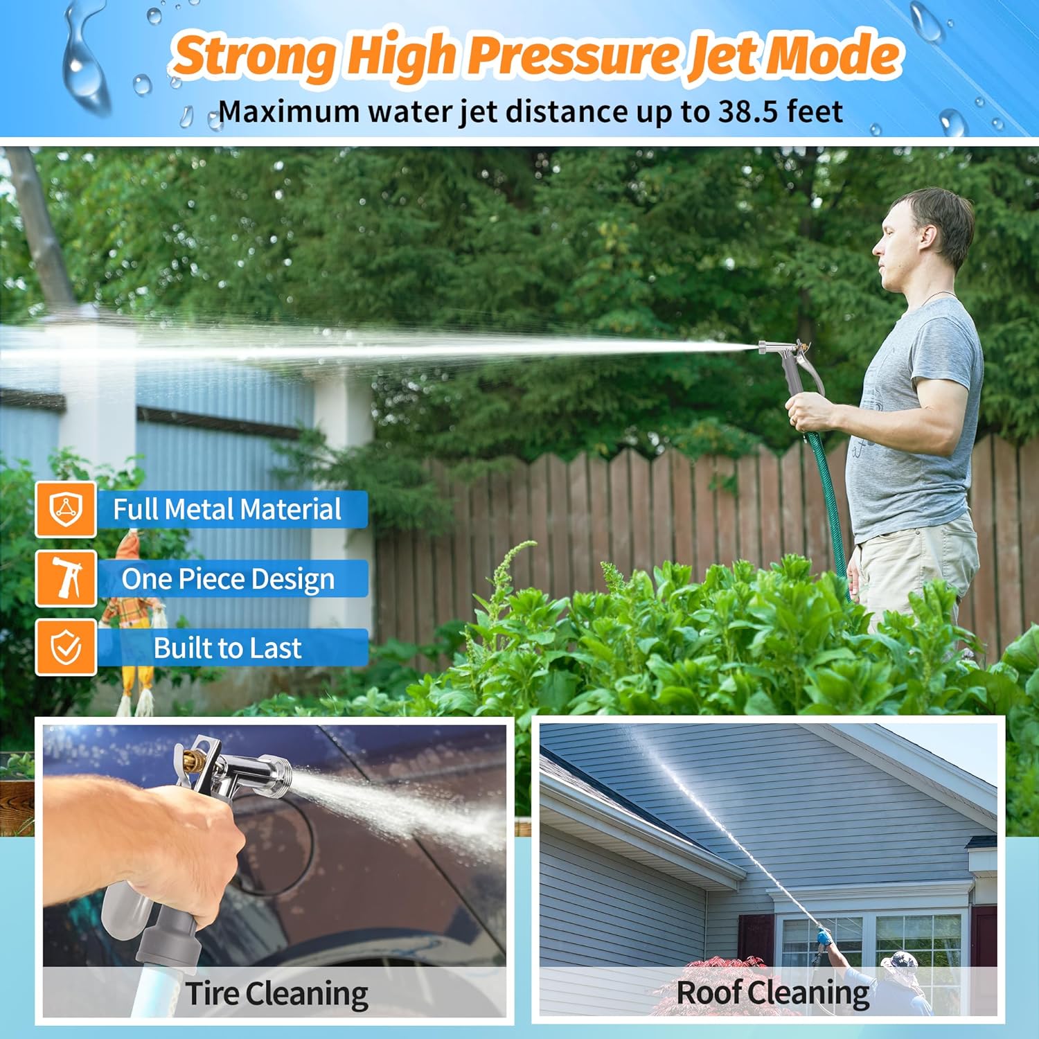 • VERSATILE FOR VARIOUS USES: Our garden sprayer nozzle is suitable for a wide range of applications, including watering flowers, washing cars, cleaning windows, showering pets, and even washing horses. The high-pressure jet setting effortlessly removes stubborn dirt, while the gentle shower setting delicately waters fragile flowers in your garden. It is a versatile tool that you can rely on time and time again, whether at home, in your lawn and garden, or in your garage.