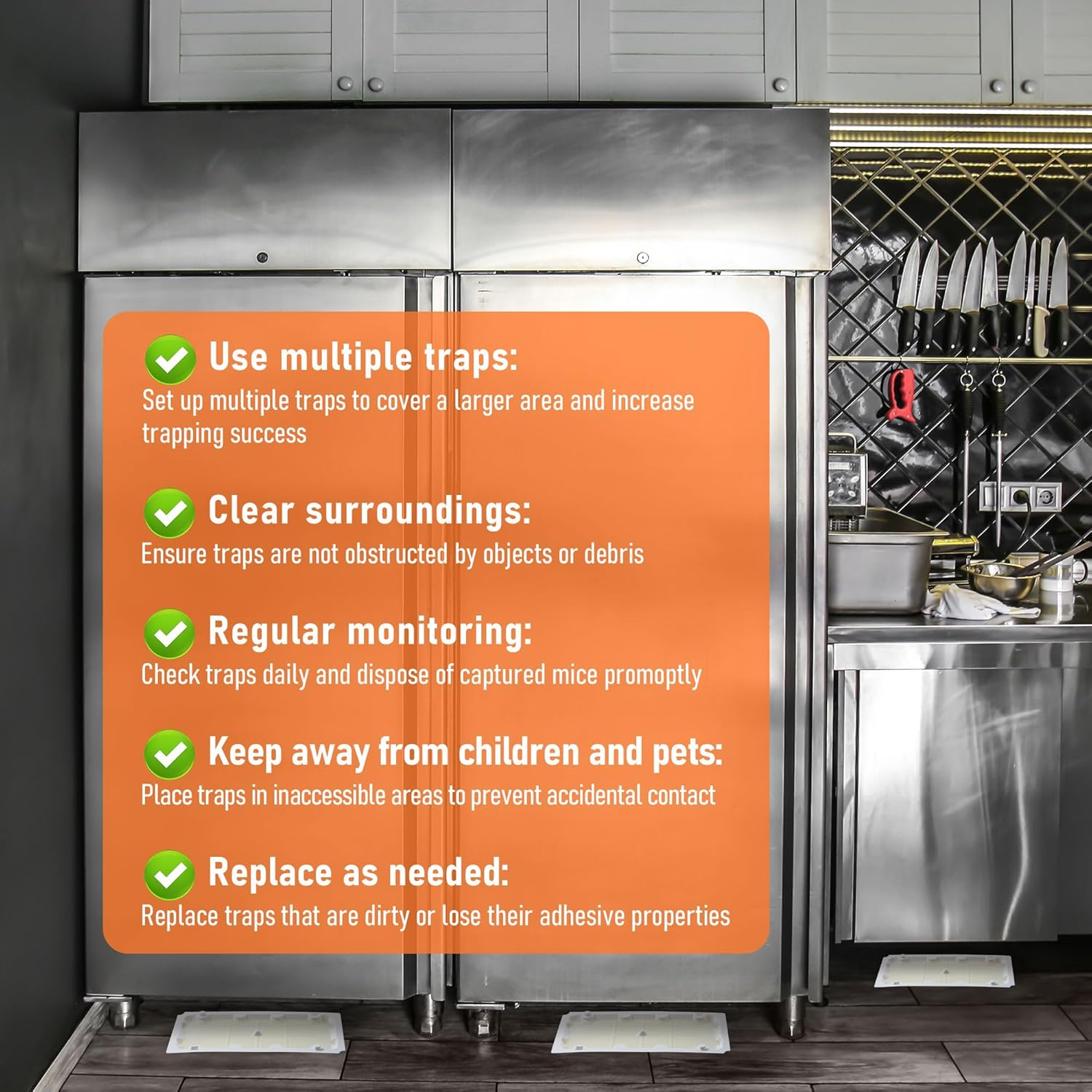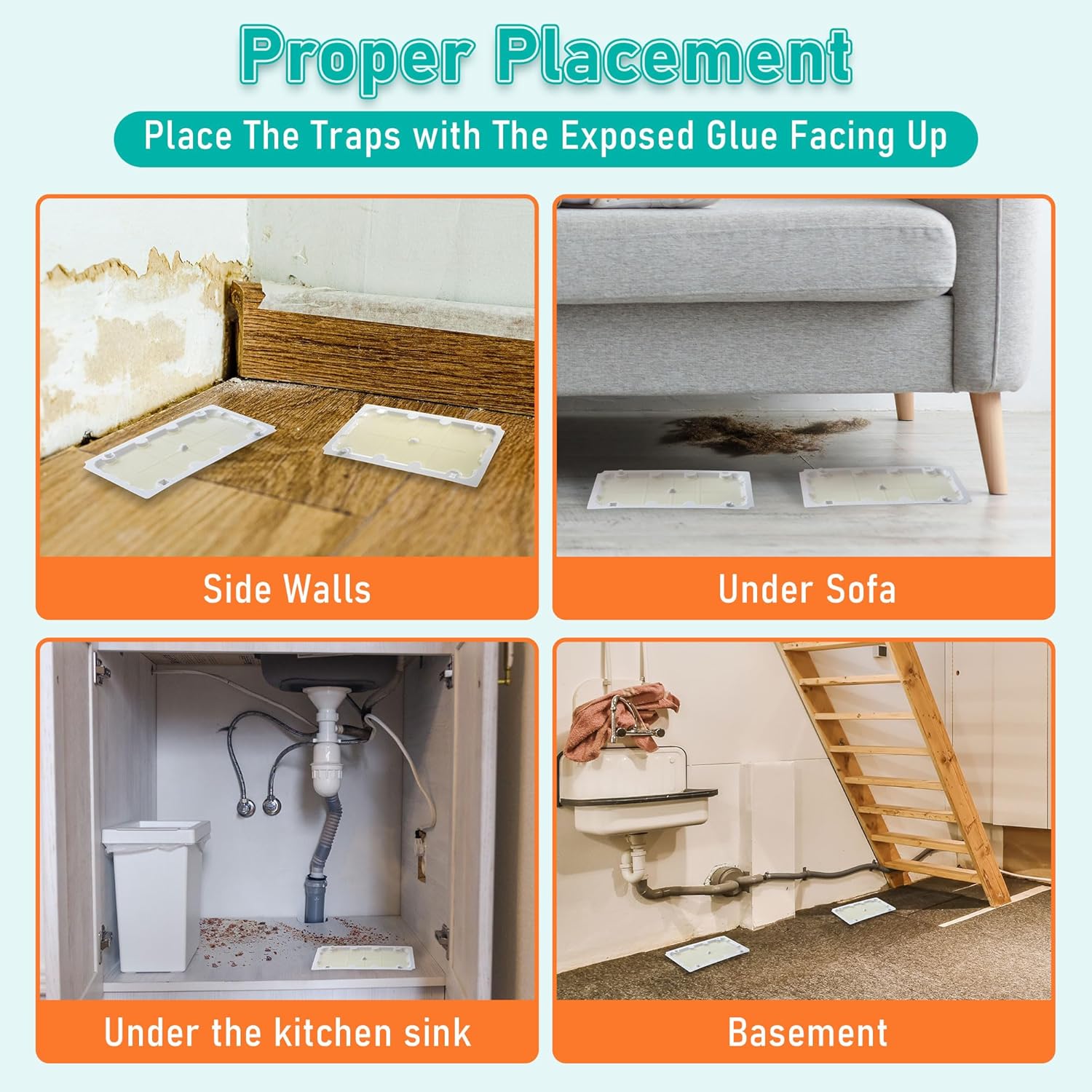 • Pest and Mouse Sticky Traps: sticky traps for mice can catch not only mice but also other common pests in your home, and we suggest you position sticky traps along active rodent runways, such as along walls, under large kitchen appliances, in cupboards, and other areas where rodents travel, be sure to fit the glue trap flush against a wall where rodents will run over and stick to it; And cold weather Qualirey glue traps for mice and rats can withstand 0° Fahrenheit weather