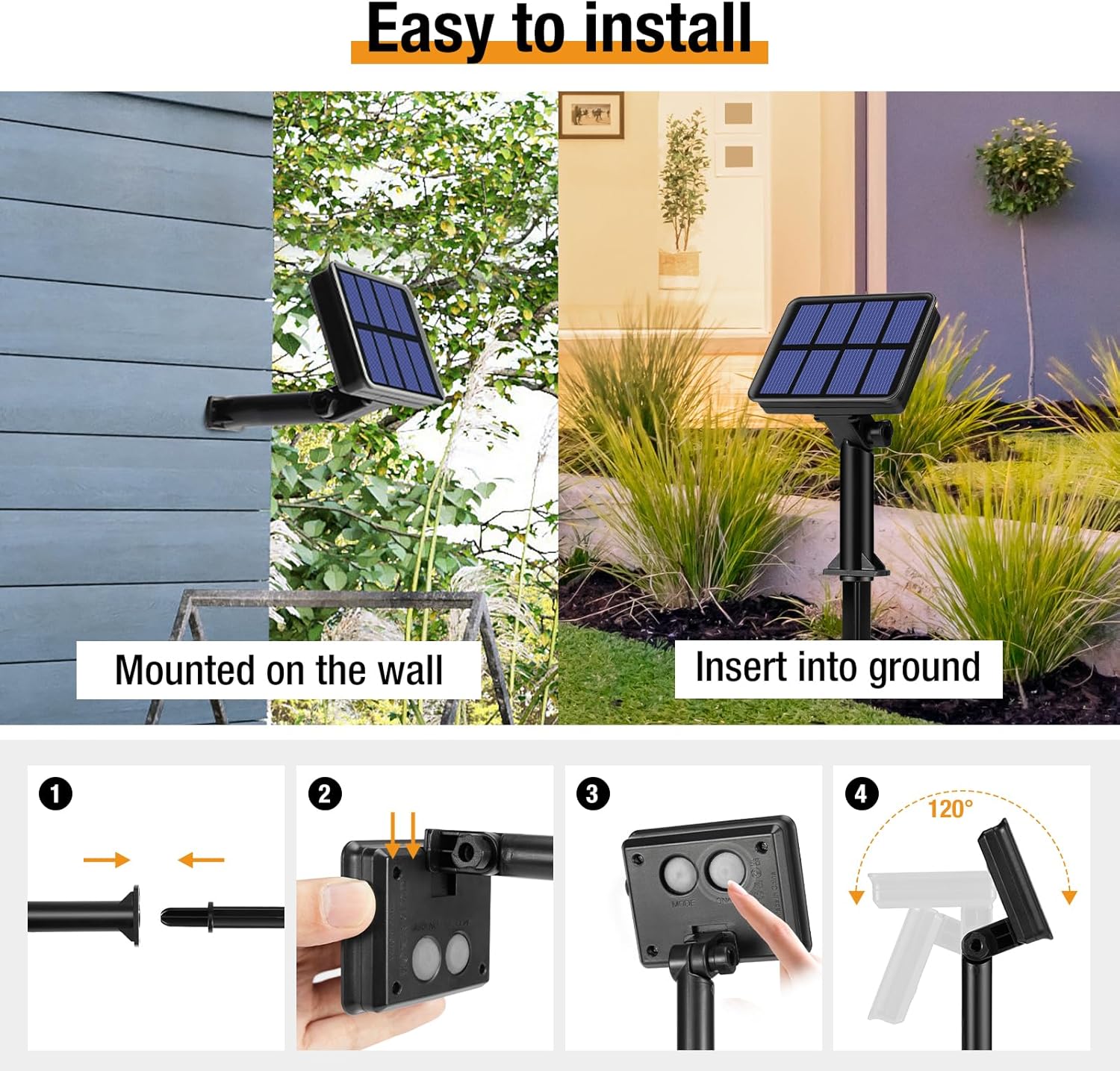• 【High Efficiency & Auto On/Off】The larger size of the new solar panel translates to a greater surface area for capturing sunlight, resulting in increased charging efficiency. That is to say the device can charge faster and potentially extend its usage time. Automatic full charge in direct sunlight for 6-8 hours and then automatically works for 10-14 hours (Note: charging and working time depend on the weather). Please press the ON/OFF button before charging.