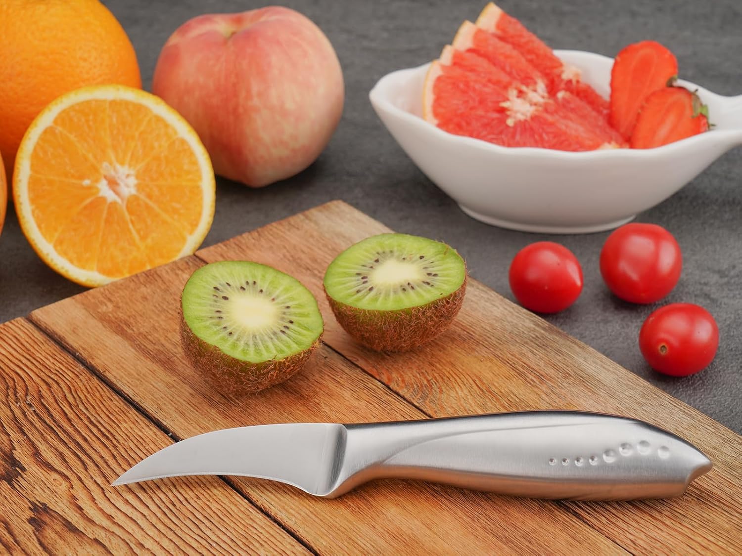 • 【ERGONOMIC PATENTED HANDLE】This 2.5 in fruit peeling knife handle is made by stainless steel for life-long durability. The patented whole stainless steel handle increases the extra strength and durability. Ergonomically designed handle shape and construction ensures a secure and comfortable grip.