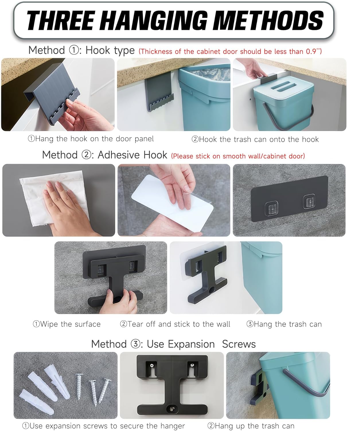 • [Under Sink / Wall Mount Trash Can] Hanging trash is an excellent choice for your daily activities. You can use it while you cook and then store it under the sink. Fit for most cabinet doors, pantry doors, cupboards, under sinks, walls, and countertops.
