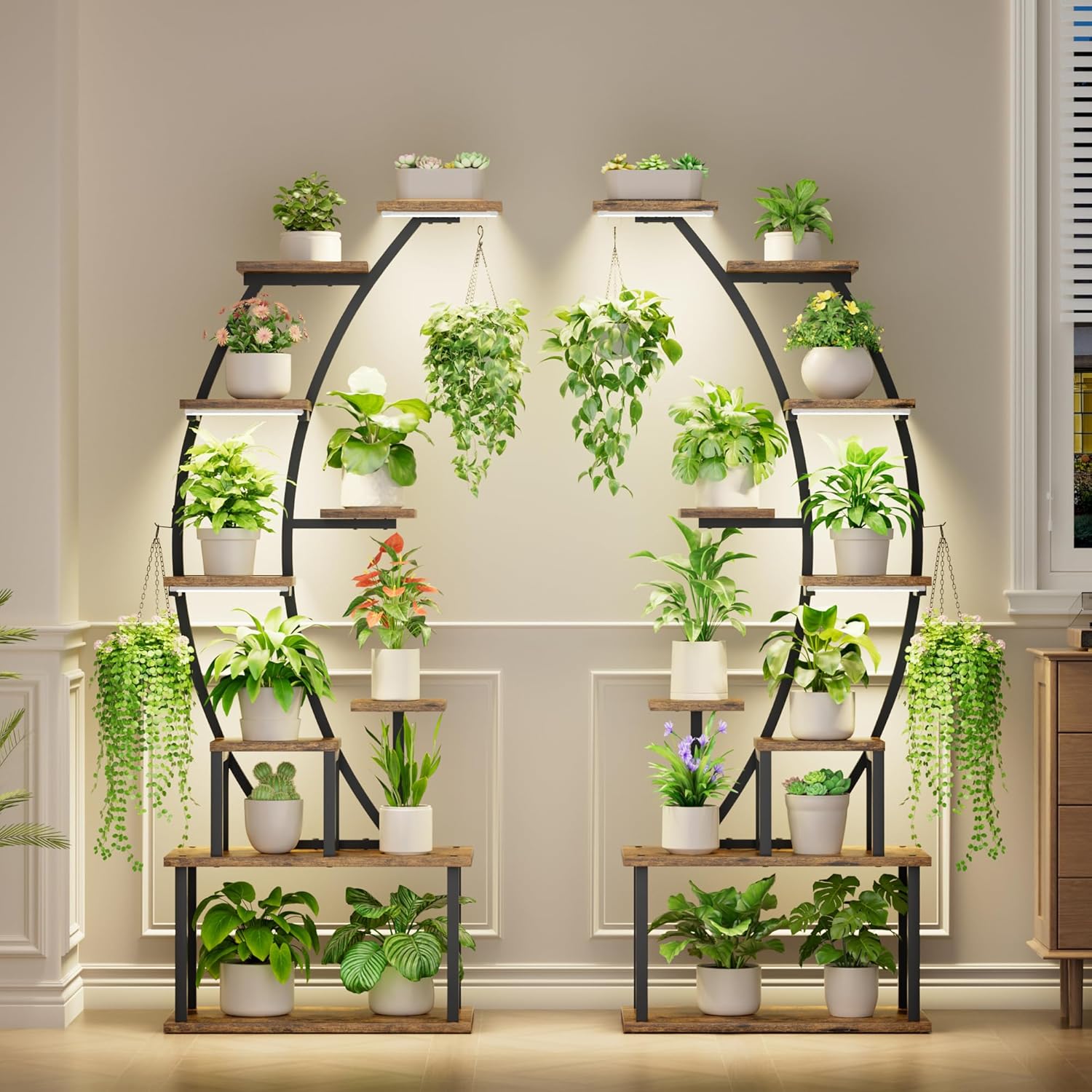 • 【Plant Stand with Grow Lights】 To promote healthy plant growth, we have equipped this indoor plant stand with full-spectrum grow lights to meet the lighting conditions that plants need most at different stages. Three-head grow lights ensure that plants on all layers receive ample light. You can place this plant shelf indoors anywhere, and also don't need to frequently move plants outdoors to absorb light.