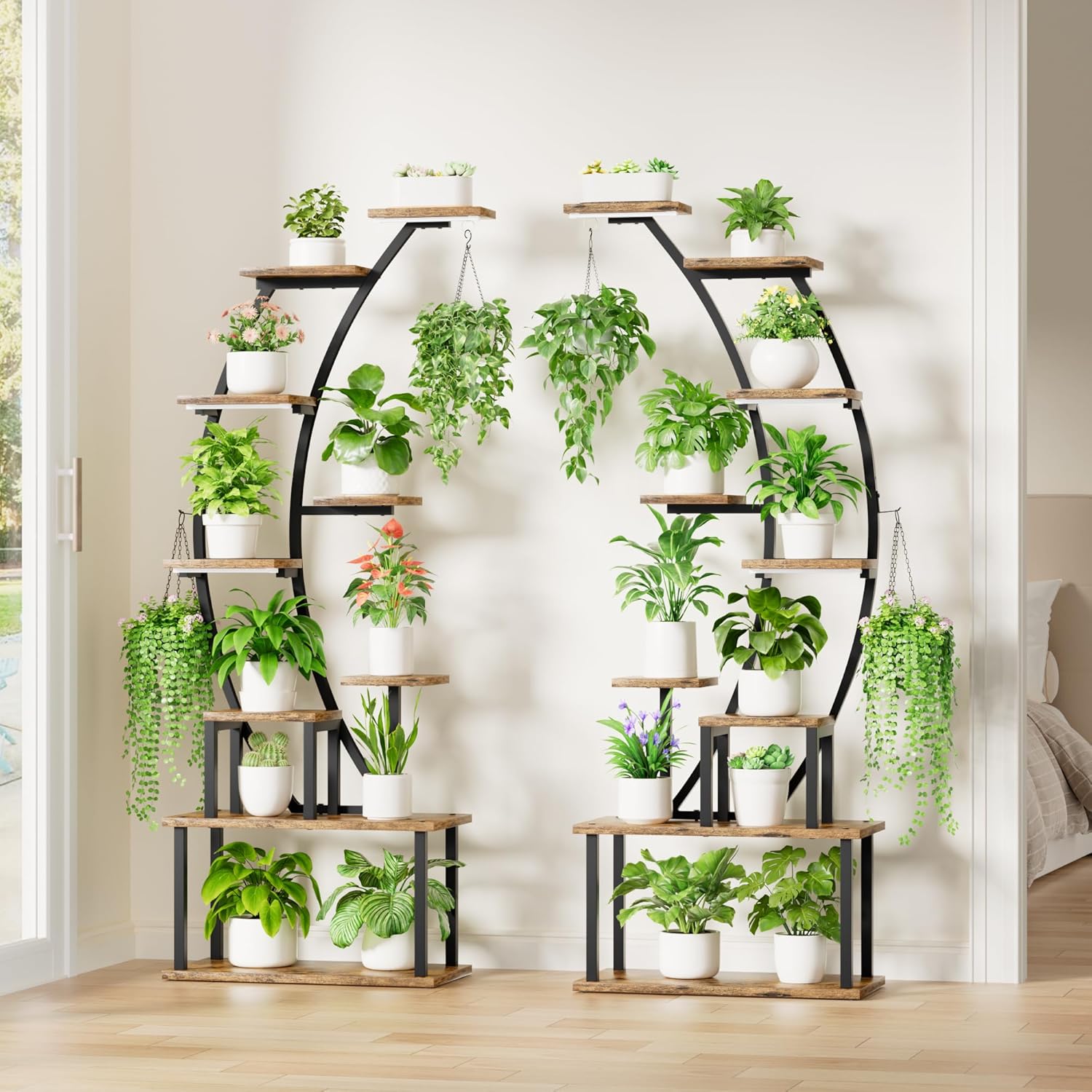 • 【9-Tier, 64" Elevated Plant Stand】 This 64" plant rack with increased height features 9 tiers, 18 pot stands, and 4 hanging hooks, providing you with ample storage space to display plants as much as possible. In addition, it can also serve as a display shelf for placing books, pictures, collectibles, awards, small ornaments, artworks, crafts, and more. This tall plant stand will be a creative addition to your home decor.